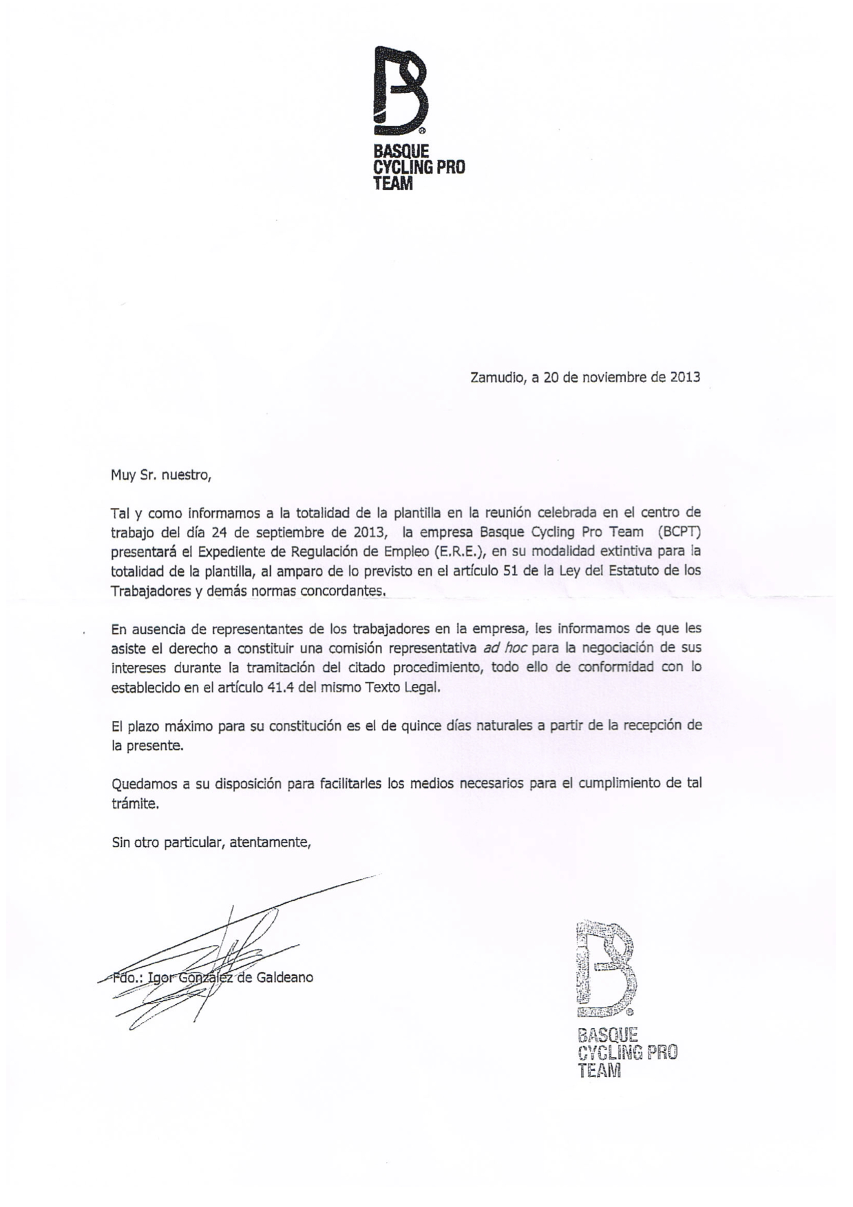La sociedad BCPT (Basque Cycling Pro Team) decidió comunicarles que presentará un Expediente de Regulación de Empleo (ERE) extintivo para toda la plantilla, lo que supone que no van a recibir la totalidad de los contratos que tenían firmados para 2014 y en el caso de Samuel Sánchez hasta 2015, lo que supone varios cientos de miles de euros.