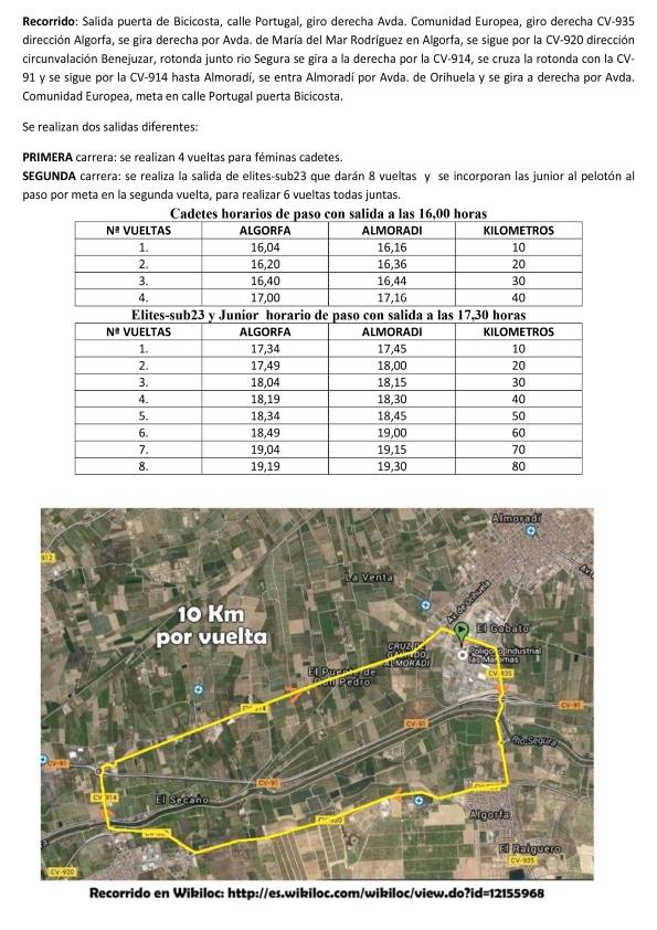 El circuito, de 10 kilómetros de distancia, tendrá salida y meta en Almoradí -delante de BiciCosta-, pasando por las poblaciones de Algorfa y Benejúzar. Las cadetes recorrerán cuatro vueltas (40 kilómetros), las júniors, seis y las élite y sub-23, ocho.