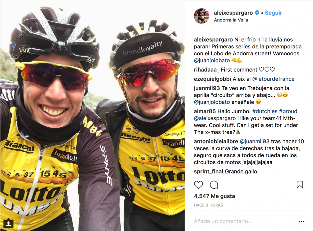 Mientras el corredor andaluz -representado por la agencia Velofutur de Juan Campos y Jorge Quintana– se mostraba tranquilo y distendido en su residencia fiscal de Andorra entrenando con el piloto de motociclismo, Aleix Espargaró con una foto desde sus bicicletas, que posteriormente borró de su cuenta de twitter. Sí publicó el catalán la misma imagen en su perfil de otra red. Burgos-BH podría ser su próximo destino. Un corredor de perfil interesante para una plantilla profesional continental debutante como la de Izquierdo.