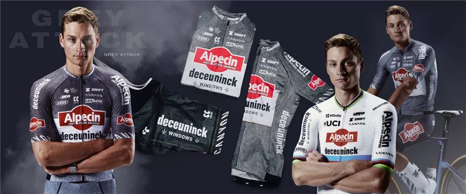 25 junio. Durante el Tour de Francia, el Alpecin belga liderado por el neerlandés Mathieu Van der Poel recorrerá las carreteras italianas y francesas luciendo una equipación «Dark Denim» con el objetivo de destacar la nueva campaña mediática de su principal patrocinador -empresa de champús- para luchar contra las canas. Para apoyar la campaña, Alpecin correrá con su tradicional camiseta vaquera en gris-negro.