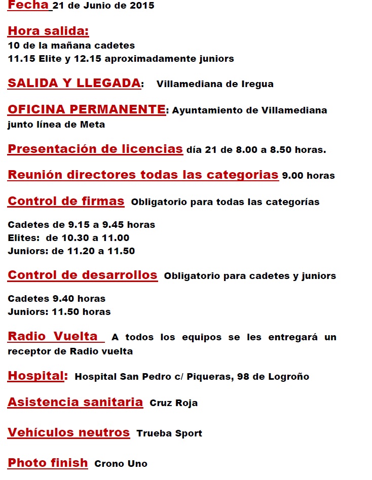 Con epicentro en la localidad de Villamediana de Iregua, en el circuito de 34,4 kilómetros que discurre por las localidades de Ribafrecha y Murillo de Río Leza, las cadetes cubrirán una vuelta, en la prueba exclusiva para ellas, a partir de las 10 h. de la mañana, mientras que las élite, que saldrán a las 11.15 h., tendrán que dar tres, incorporándose las júnior en el primer paso por meta (sobre las 12.15 h.), para dar los dos últimos giros.