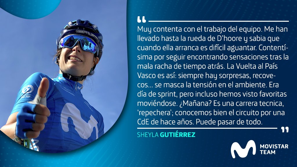 Sandra Alonso: «Estoy muy contenta con el resultado, que demuestra que seguimos en la buena línea y con buenas piernas después de haber corrido la Vuelta a Burgos. Un top-10 en un esprint ante las mejores del mundo es para estar satisfechas, pero no nos podemos conformar y seguiremos dando guerra de aquí al sábado para dejarnos ver en una carrera que es, lógicamente, muy importante para todo el equipo».