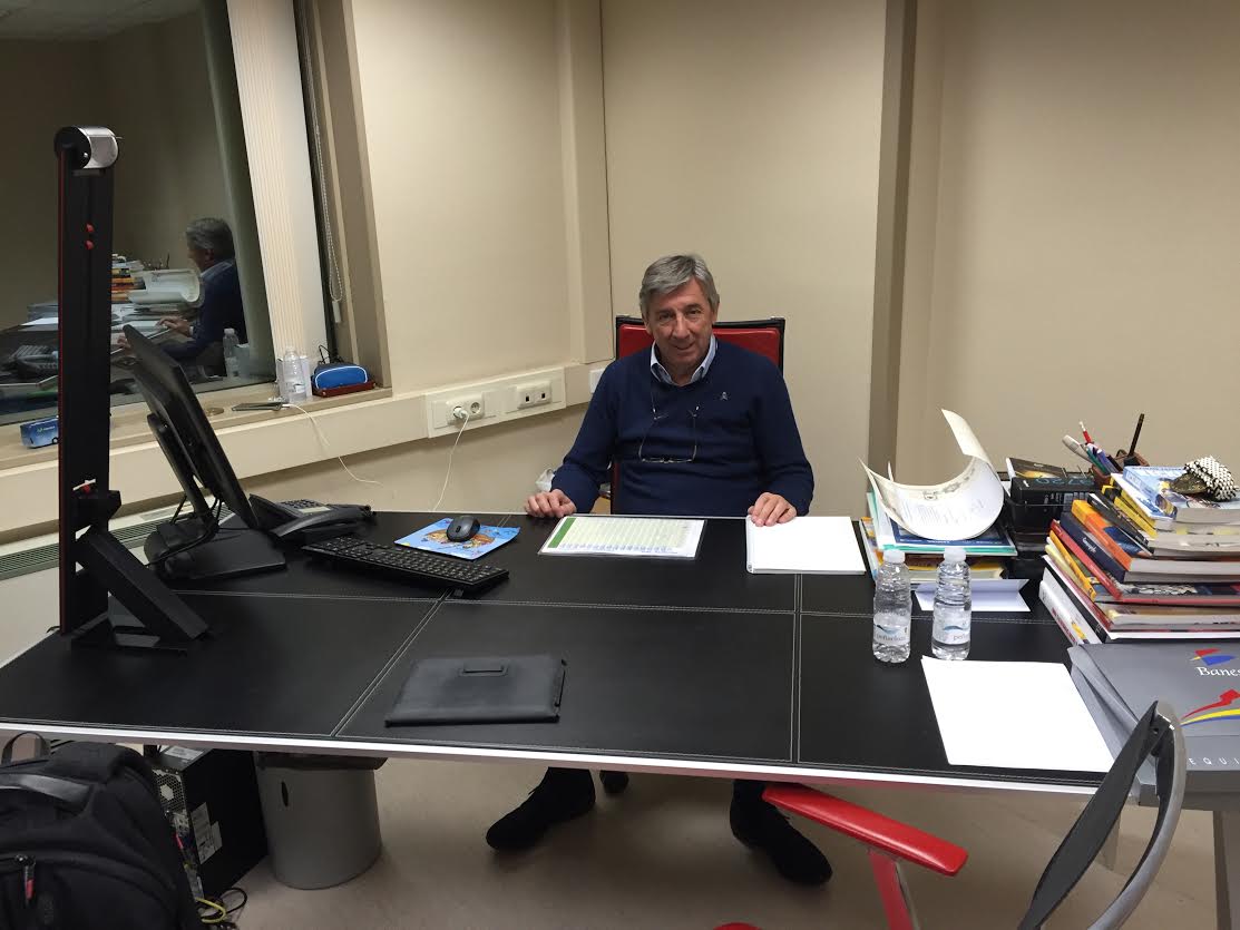 La nave que alberga la sede central y el parque móvil del Movistar -incluido su lujoso y cómodo autocar para los protagonistas-, talleres, almacenes y oficinas se completa con el despacho del jefe, del mánager. Una habitación sobria, sin ostentaciones, y con decenas de libros, pósters -el de Indurain de Burdeos con la «espada»-, dossiers de prensa, placas, cuadros, medallas y un sinfín de articulos que Eusebio Unzue quiere ordenar e ir mas allá. «Mi idea es abrir un museo con todo el material histórico del que disponemos, pero aún no sé cuando será posible». Mientras, en un aparador enfrente de su mesa de trabajo se ven expuestos una pequeña selección de trofeos -como el de ganador por equipos del pasado Tour-, recuerdos, objetos -el casco rosa de Nairo Quintana del Giro 2014- y fotografías -como la de Miquel Poblet reclamando una rueda- y donde no faltan las joyas de la corona, los tres trofeos consecutivos del UCI World Tour al mejor equipo. Su espacio de trabajo no pasa de un ordenador (pc), el obligatorio teléfono móvil -intuimos su compañía- que obliga a interrumpir sin problemas la entrevista un par de veces y un cuadrante en el que controla a sus corredores y el exigente calendario que afronta en 2016. Una conversación en el núcleo.
