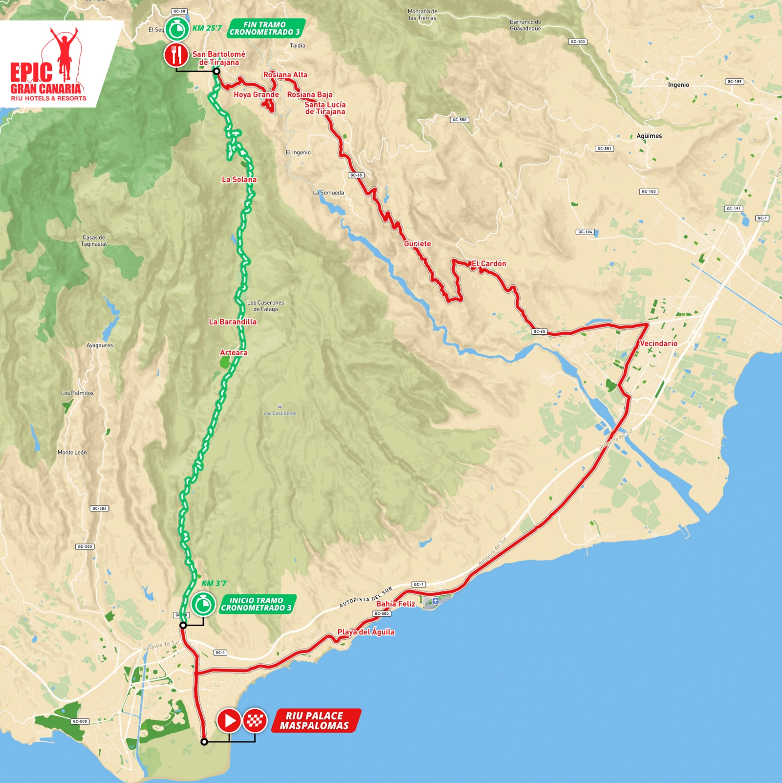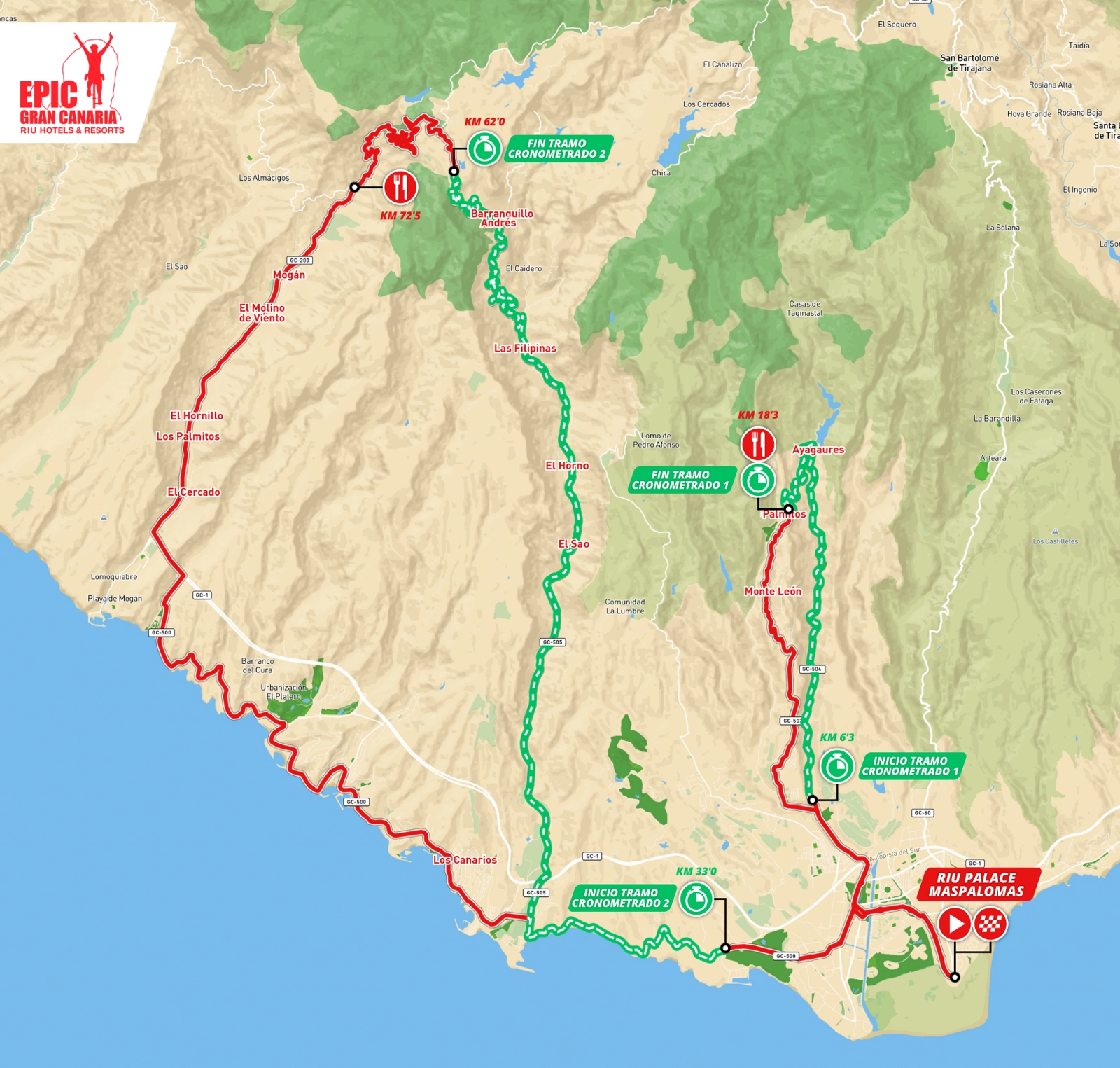 El crono 1 es la icónica subida a Ayagaures, 12,3 kilómetros de paisaje y deporte hasta la cima Pedro González. El crono 2 de esta etapa parte de la zona conocida como el alto del Salto del Perro con 29 kilómetros desde Pasito Blanco hasta el alto para dar la mejor versión de cada uno de los deportistas. Tras el segundo tramo, la bajada se realiza de forma neutralizada hacia Mogán, garantizando la seguridad de los participantes.