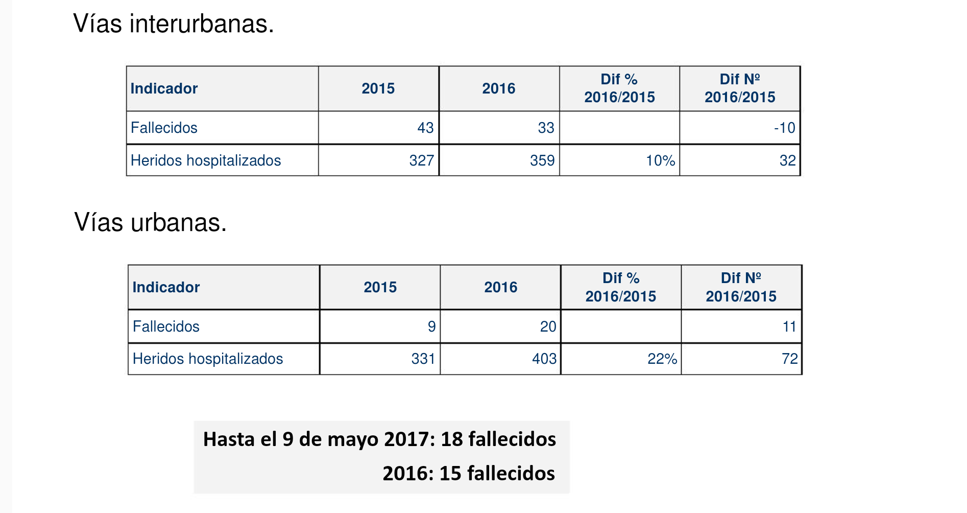 De la misma manera, los datos que aporta la DGT en 2015 y 2016 varían. En vías interurbanas, en 2015 se produjeron 43 fallecidos, mientras que en 2016 fueron 33. Hasta el pasado 9 de mayo, la lista de 2017 ya suma 18, mientras que en ese mismo periodo de 2016, eran 15. En vías urbanas, se pasó de los 9 fallecidos en 2015 a 20 en 2016.