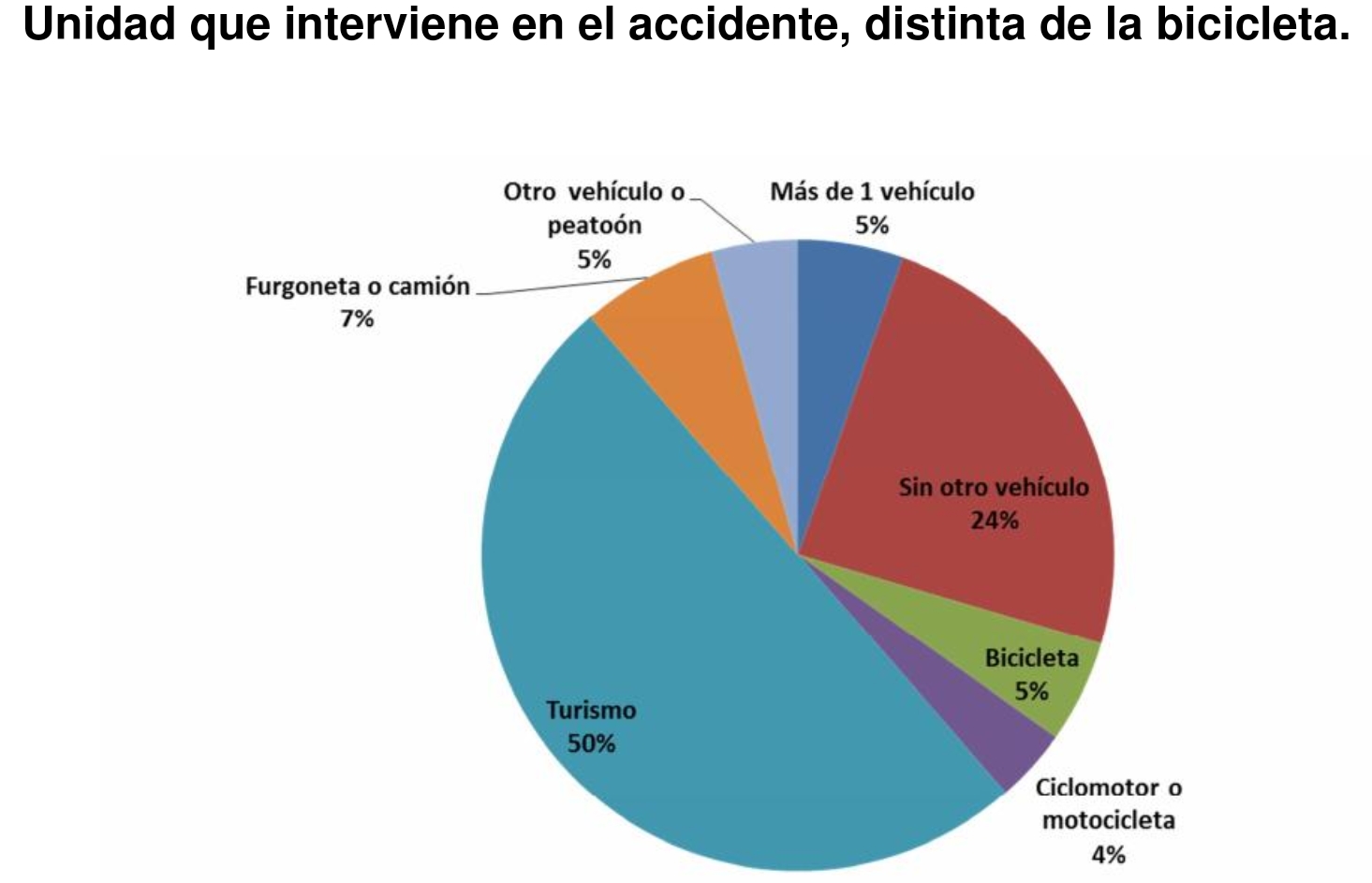 En cuanto el factor que interviene en el accidente, en un 50% de los casos se produce con un vehículo turismo, mientras que con una furgoneta o camión es en un 7%, un 4% con una motocicleta, un 5% con otro tipo de vehículo o con un peatón, y un 5% entre bicicletas. En un 24% de los casos los accidentes se producen sin la intervención de ningún otro vehículo.
