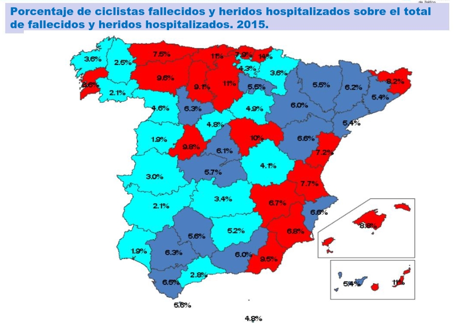 Los datos aportados por la DGT dejan un mapa de España en el que el porcentaje de ciclistas fallecidos y heridos hospitalizados sobre el total en 2015 marca en rojo comunidades como la valenciana, Murcia, Castilla y León, Cantabria y Asturias, sin dejar de lado los alarmantes datos de provincias como Almería, Girona, Albacete o Ávila, entre otras.