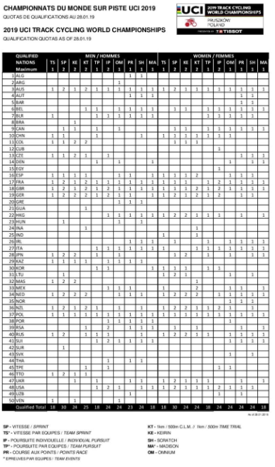 Australia, Francia, Gran Bretaña y Polonia serán los únicos países que contarán con ciclistas en todas y cada una de las pruebas, en una participación de 50 naciones.