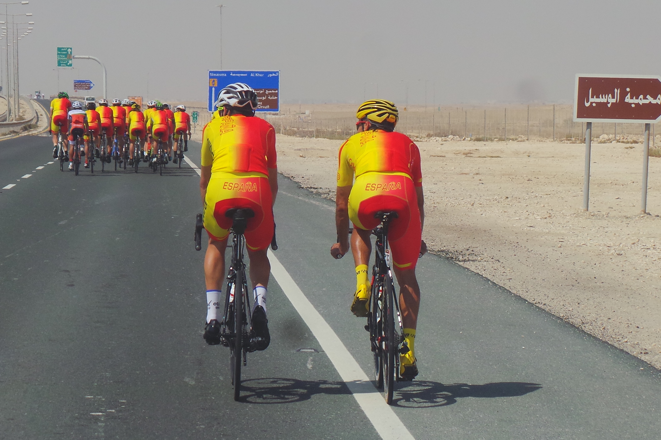 La selección española ha realizado esta mañana su primer entrenamiento en Doha. Con la excepción de los ‘pros’ Jonathan Castroviejo e Imanol Erviti, bajo la disciplina de Movistar, preparando la contrarreloj por equipos de mañana, todos los integrantes de las demás selecciones entrenaron esta mañana en Doha, aunque los entrenamientos fueron distintos, desde algo más de una hora hasta las tres de los ‘prós’ que fueron acompañados por algunos corredores del resto de categorías.