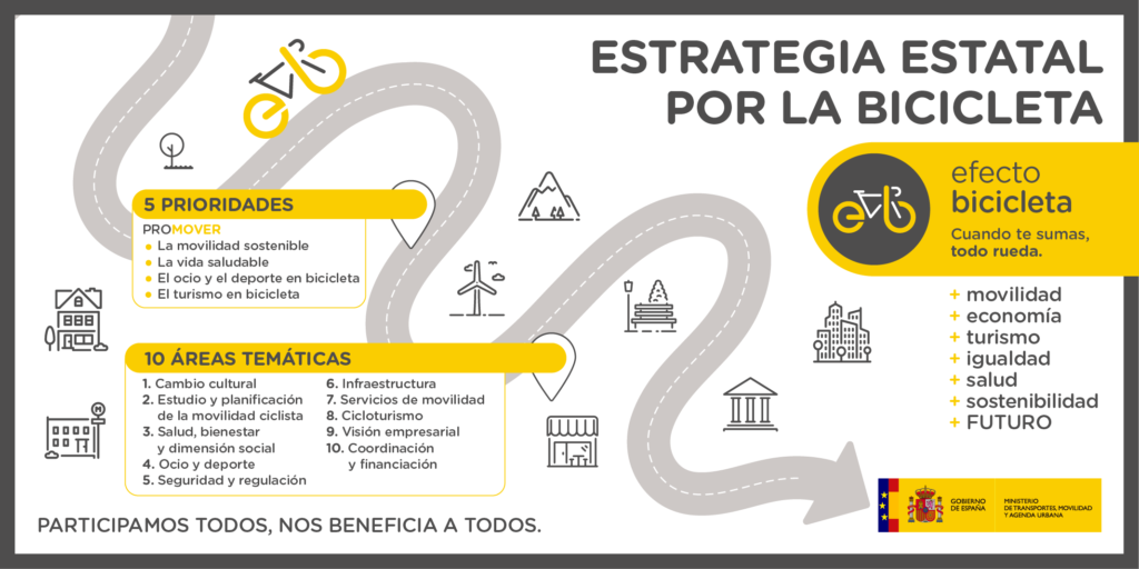 En este escenario, Mitma (Ministerio de Transportes, Movilidad y Agenda Urbana) aborda el impulso de la «Estrategia por la Bicicleta» con el objeto de coordinar las diferentes políticas y acciones en torno a la promoción de este medio desde todos sus ángulos, desde la movilidad hasta sus beneficios para la salud, pasando por su uso recreativo y deportivo, por el desarrollo empresarial del sector, o como base para un turismo basado en la bicicleta.