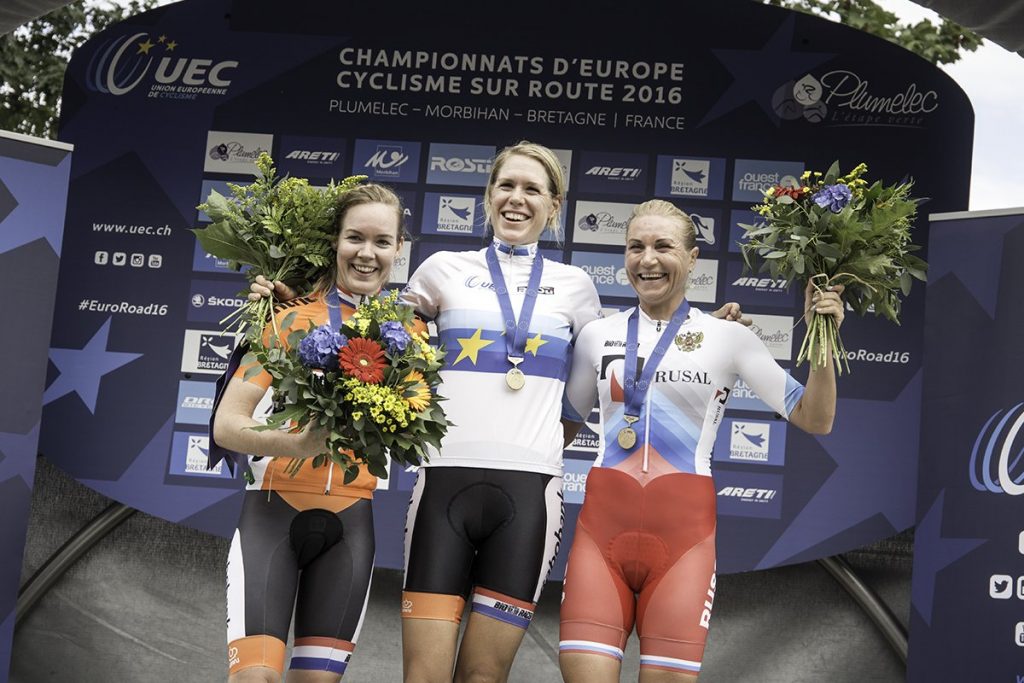 Podio absoluto de las féminas tras la CRI © UEC Cycling