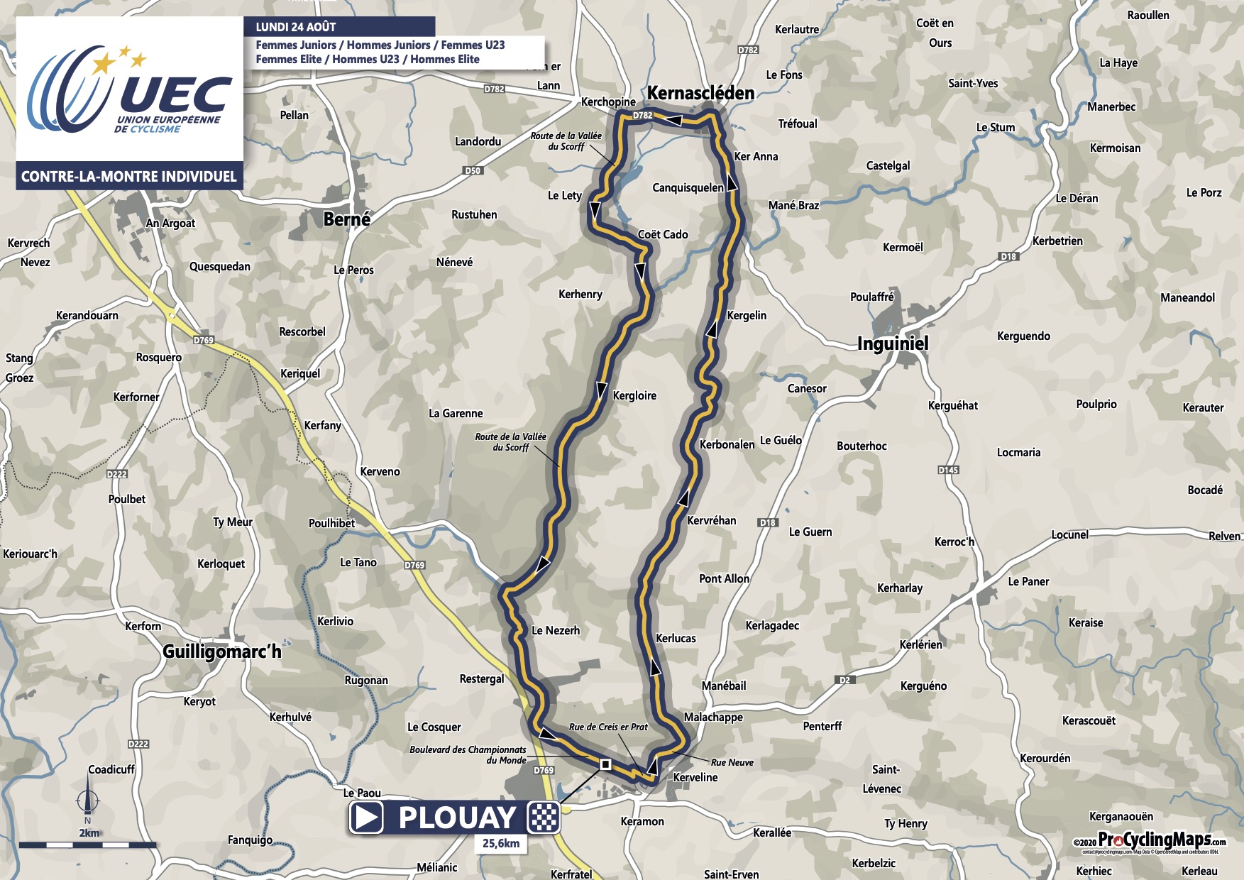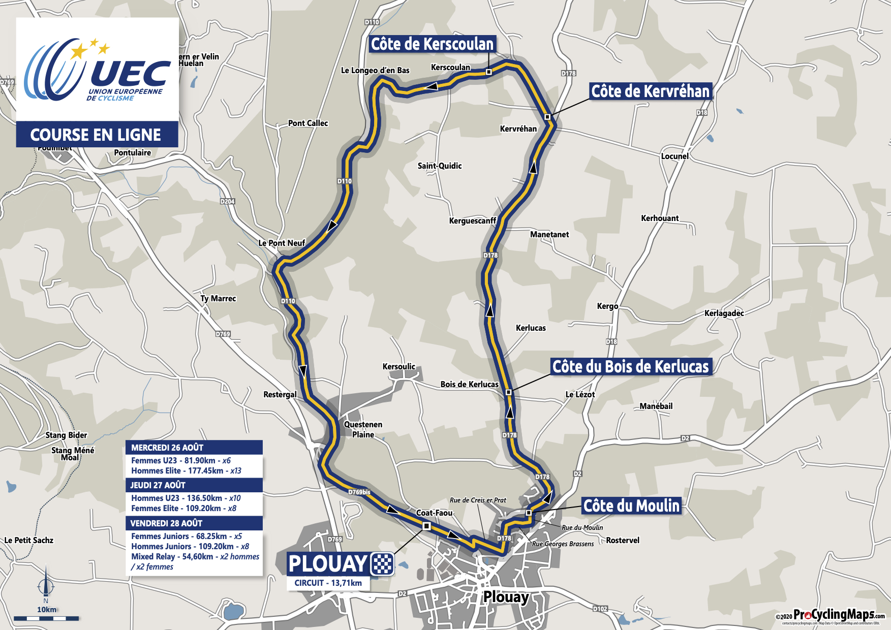El Secretario General de la Unión Europea de Ciclismo, Enrico Della Casa, comprobó de primera mano los circuitos de Plouay (Morbihan) para el Campeonato de Europa 2020. Según Ouest-France, el representante de UEC validó estos dos recorridos el circuito de 13,650 km para carreras de línea (178,7 km para los Hombres Élite y 107 km para las Féminas) y el circuito de 24 km, al norte de Plouay, para la contrarreloj.