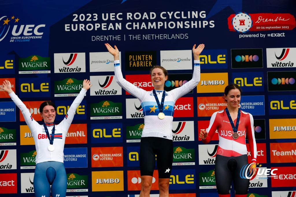 No sufrió Marlen Reusser para volver a conseguir su tercer título mundial europeo consecutivo en la disciplina de contrarreloj. La ciclista suiza -que cumplía 32 años en el día de hoy- se impuso con comodidad con un tiempo de 35:53. A lo largo de los 36 kilómetros fue de menos a más, siendo superada en el primer punto intermedio por Christina Schweinberger que fue más rápida por apenas dos segundos. A partir de estas alturas de crono, Reusser puso la directa -1ª en el segundo punto intermedio- y llegó a meta con una amplia ventaja de 43 segundos sobre la británica Anna Henderson (36:36) y la austriaca Christina Schweinberger (36:37).