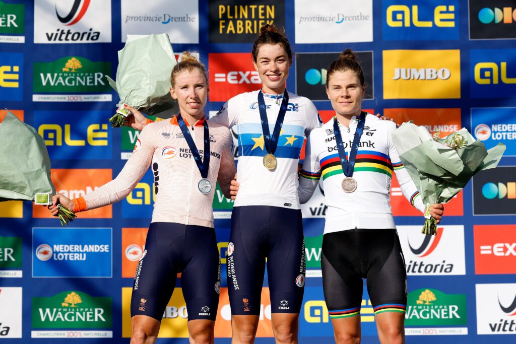 Doblete para Países Bajos en Drenthe -su casa- con un maillot de campeona de Europa que tiene nueva dueña. Se trata de Mischa Bredewold, la encargada de escribir su nombre en el palmarés de la prueba sucediendo a su compatriota y compañera de equipo, Lorena Wiebes. La velocista se tuvo que conformar con la medalla de plata, al no tener opciones de defender su preciada prenda tras el ataque de Bredewold a 10 kilómetros de meta que le permitió llegar a la línea de meta en solitario, aunque con escasos segundos de ventaja. El maillot continúa en poder de Países Bajos, así como del equipo SD Worx, que como viene siendo habitual obtuvo de manera indirecta un triplete, al adjudicarse Lotte Kopecky -la vigente campeona del mundo- la presea de bronce.
