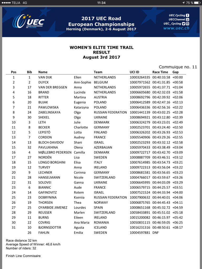 La holandesa Ellen Van Dijk ha vuelto a demostrar que es la mejor europea en la modalidad contra el crono y ha conseguido su segundo título continental en la prueba individual disputada esta mañana en Herning (Dinamarca). La española Lourdes Oyarbide ha finalizado 27ª a 4’59» de la vencedora.