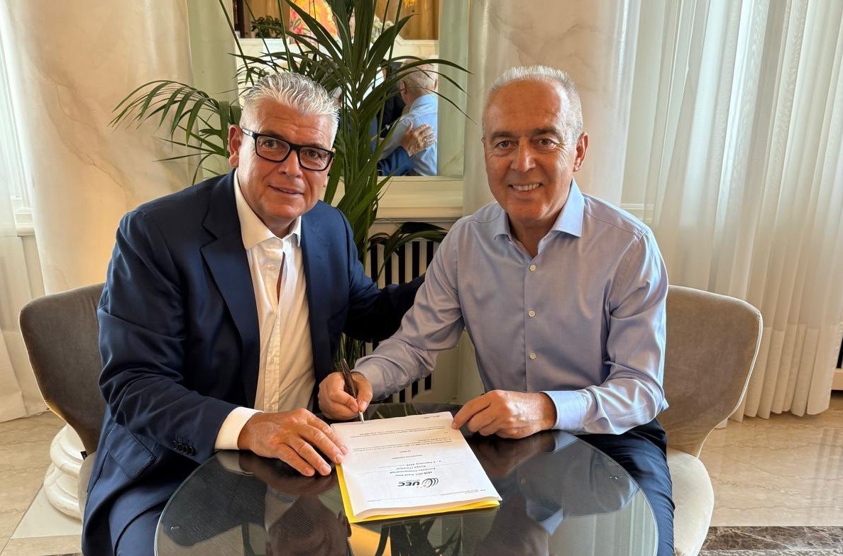 Aunque ya era conocido desde hace bastante tiempo que el Campeonato de Europa élite de 2026 se disputará en el nuevo velódromo de Konya (Turquía), no fue hasta ayer que la UEC y la Federación turca oficializaban este compromiso, con esta foto del presidente de ambas entidades, Enrico della Casa y Emin Müftüoğlu, firmando el acuerdo.