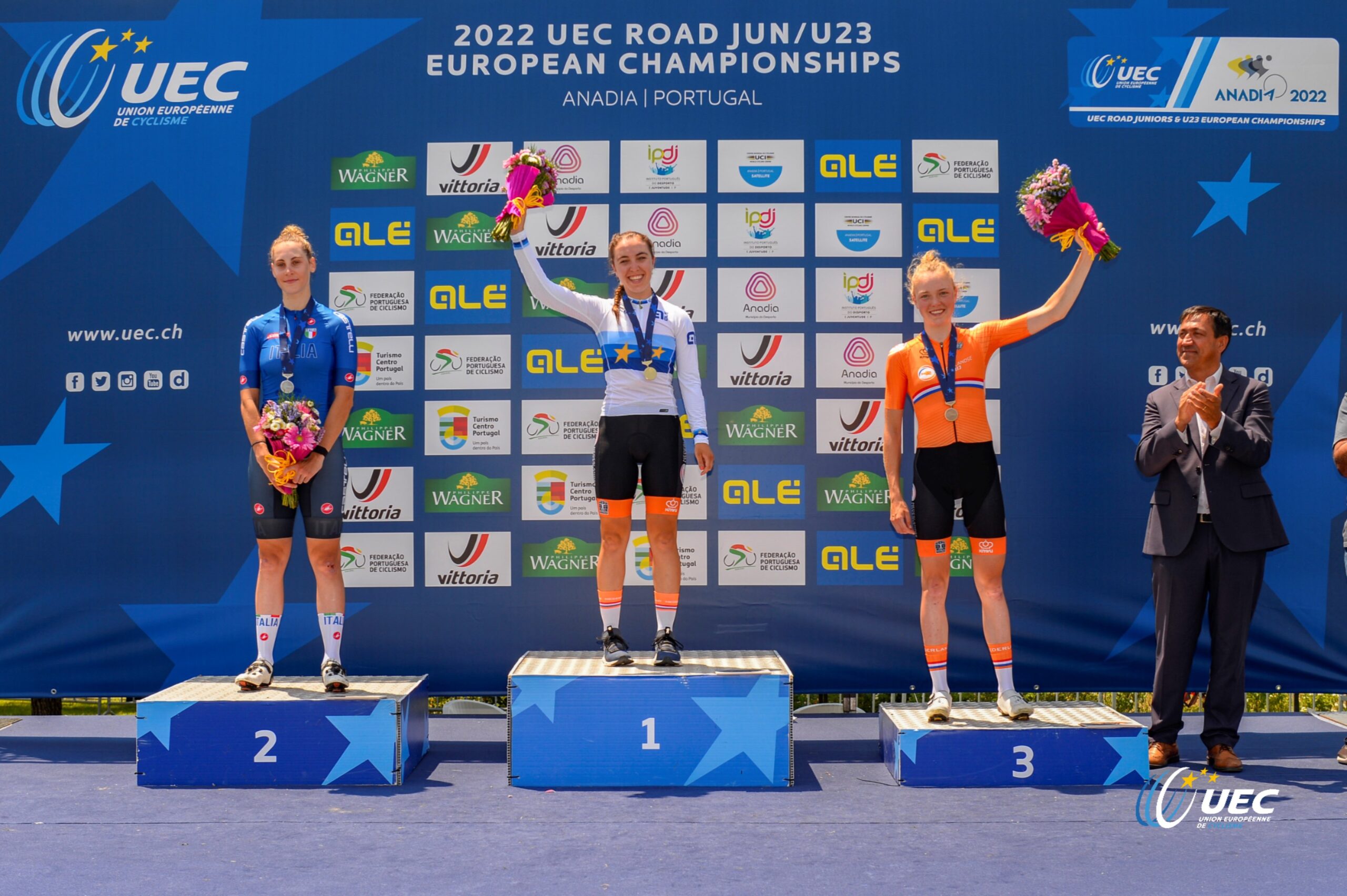 Pronto empezaron los movimientos en una carrera marcada por la cota de unos dos kilómetros situada mediado el circuito, aunque no fue hasta la tercera vuelta cuando se conformó la escapada más larga de la jornada, con protagonismo para Mireia Trías. La española, junto a otras siete corredoras, lograron llevar su renta hasta cerca de los dos minutos, terminando su viaje en el penúltimo ascenso al puerto, donde se conformaba un grupo delantero de unas 40 unidades con Amondarain, Trías y Cantera. La última subida resultaba decisiva y finalmente Inés Cantera finalizaba 31ª; Amondarain 36ª y Trías, 39ª; con Eraso y Banllés terminando en los puestos 58 y 59. La neerlandesa Van Anrooij, nueva campeona de Europa.
