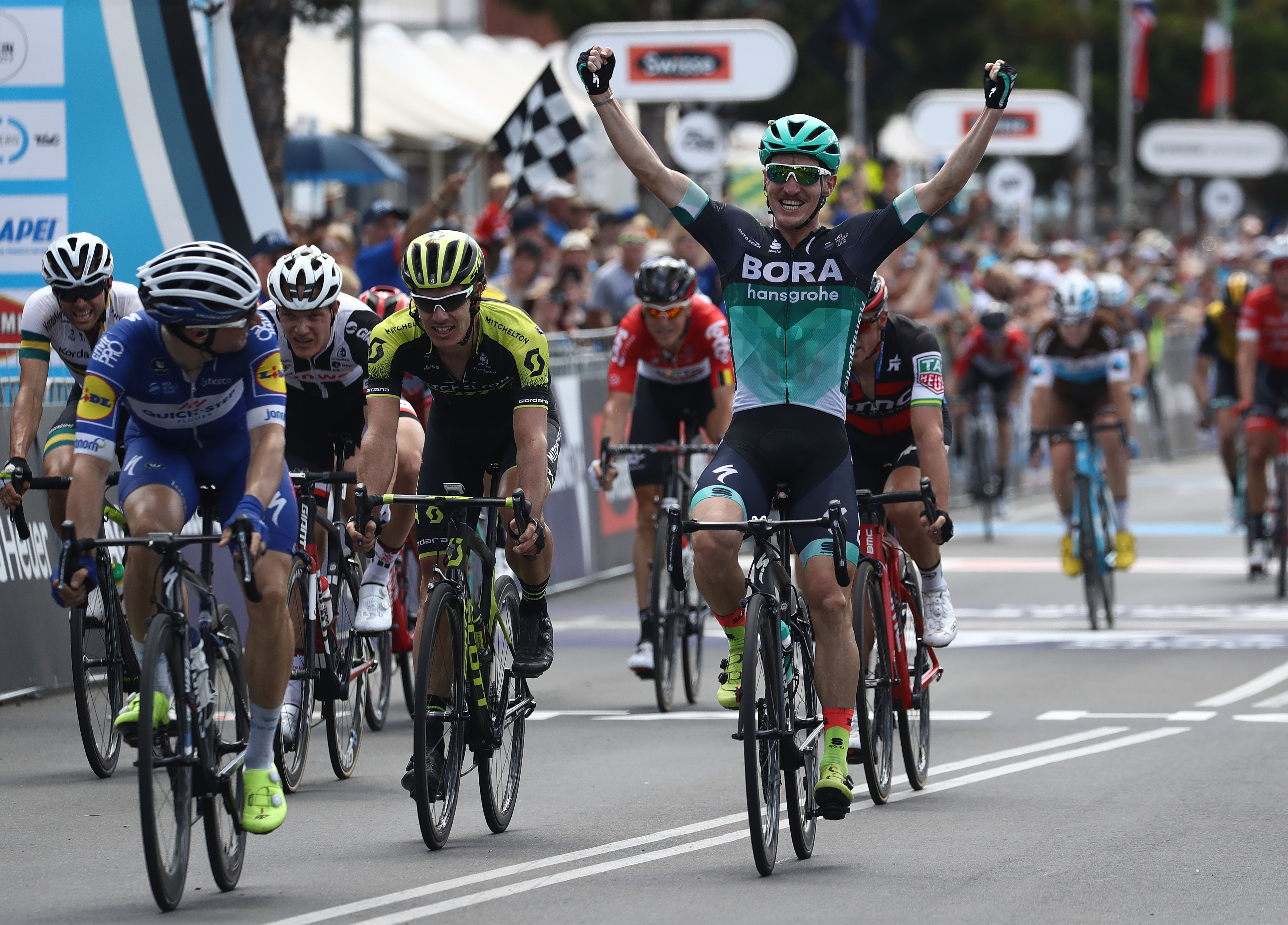 Mitchelton-Scott fue el equipo que se encargó de llevar el peso del pelotón hasta que a falta de 15 kilómetros para la línea de meta dieron caza a Kotchetkov, Porter y Hansen, únicos supervivientes de la fuga. Esteban Chaves (Mitchelton-Scott), Simon Gerrans (BMC), Daryl Impey (Mitchelton-Scott) o Jay McCarthy fueron algunos de los protagonistas de una fuga de nueve hombres que se formó ya en el tramo final de la prueba, un corte que fue el bueno para que el australiano de Bora-Hangrohe acabara llevándose el triunfo cuando el pelotón ya se les echaba encima.
