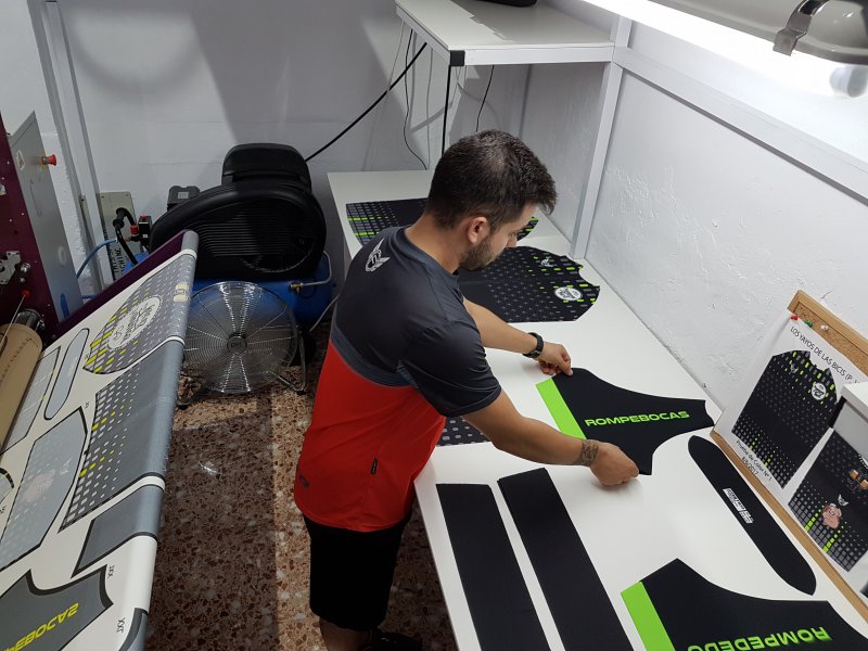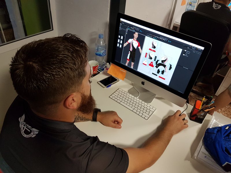 Una vez con la base del pastel conocida, se recibe la información de lo que el cliente quiere poner en la equipación. Entonces llega el boceto digital, el envío y la confirmación del cliente de que todo sigue el camino acordado. Una vez confirmado el trabajo, se procede a hacer la prueba de color y el envío para, posteriormente, empezar con la adaptación del pedido a las diferentes tallas.