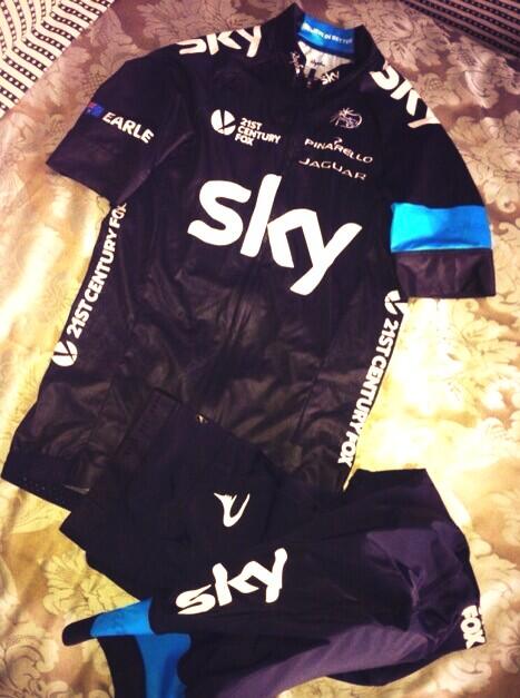 Chris Froome ha servido de improvisado modelo para presentar en su twitter el rediseño del mono que lucirá el Sky -de la marca Rapha-, previsiblemente en los días calurosos, a tenor de las transparencias que exhibe.