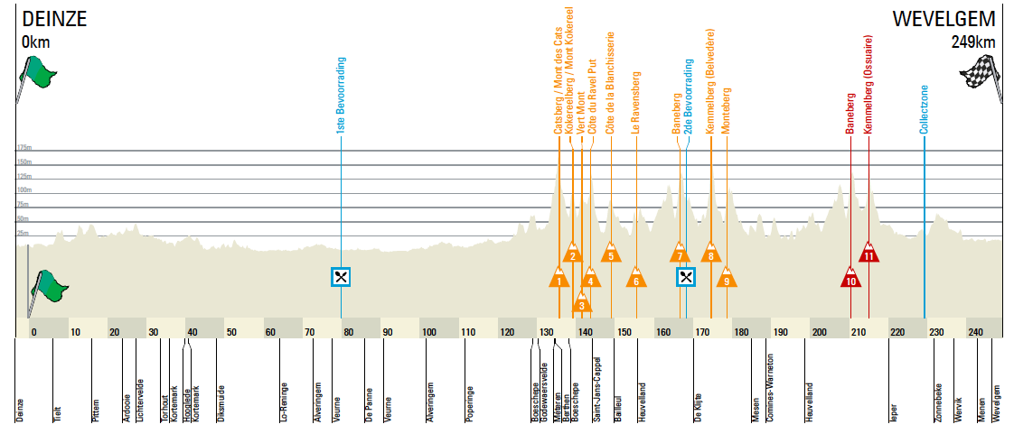 Las primeras ascensiones, que comenzaron con el Catsberg, a 113 kilómetros de la meta, sirvieron, como es normal, para ir dejando atrás a los más débiles. Los nervios y el gran número de corredores que todavía integraban ese gran grupo provocaron varias caídas que también contribuyeron lo suyo a reducir el tamaño de ese pelotón. Sin duda alguna, fue el conjunto Katusha-Alpecin el que se llevó la mayor ración de mala suerte hoy al ver cómo Tony Martin, que poco antes había incluso provocado un importante corte en la cabeza del grupo, como Sven Erik Bystrom, con una fractura en la mano, tenían que decir adiós desde el suelo casi al mismo tiempo que Alexander Kristoff, su gran baza para esta prueba, se despedía de cualquier opción al sufrir una avería en pleno tramo de tierra.