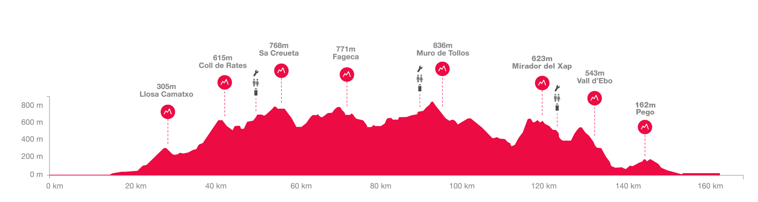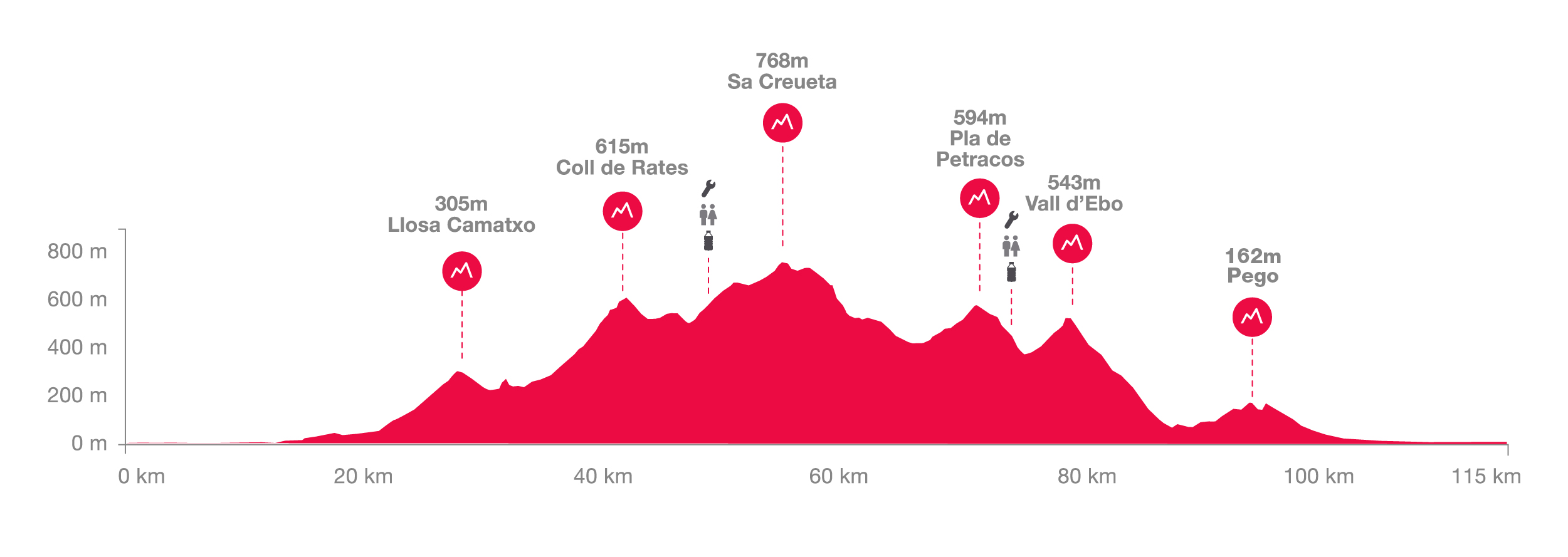 Los primeros en tomar la salida serán los 2.000 participantes de la Gran Fondo. Saldrán a las 8:00 en dos tandas y deberán recorrer 162 kilómetros y más de 3.000 metros de desnivel positivo. Con un total de ocho puertos, destacan las subidas de Coll de Rates, Sa Creueta y el Muro de Tollos.