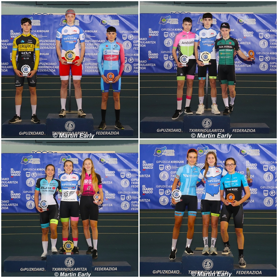 Los juniors Ander Otegi (AMPO) e Izaro Etxarri (Andoaingo) y los cadetes Urko Nazábal (Limousin Kartoiak) y Maixa Odriozola (Zu-k-Limousin) se han proclamado campeones de Gipuzkoa de velocidad, en el transcurso de la segunda y última jornada del Campeonato, celebrado este fin de semana en el velódromo de Anoeta, y con el que se ponía fin a la larga e intensa temporada invernal de pista a cargo de la Federación Gipuzkoana.