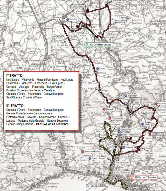 Almonetto, Baldaccini, Meiler, Motta, Petrelli, Ricci, Viel y Wright -y más tarde Tsarenko– aprovecharon los primeros kilómetros llanos para fugarse de un grupo en el que Israel, Intermarché y Kern Pharma controlaron sin estrés a los que no les dejaron acumular más de 3 minutos. Almonetto y Viel fueron los primeros en ceder en el segundo de los cinco puertos alrededor de Génova y a 77 kilómetros de la urbe transalpina el grupo los neutralizó.
