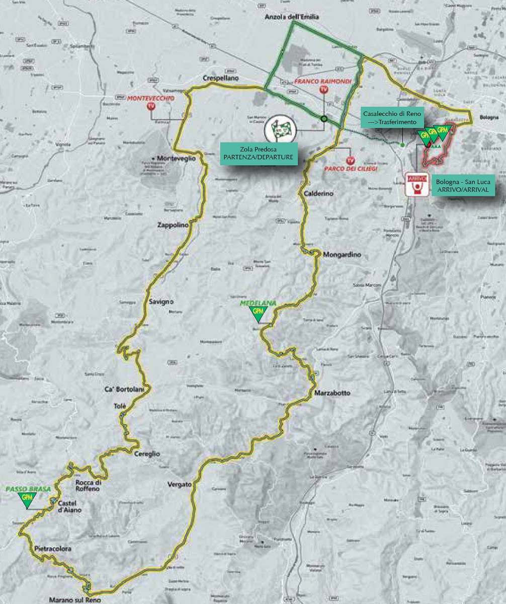El primer ascenso a San Luca (2.1km al 9.4) seleccionó aún más la fuga quedando únicamente Andrea Garosio y Giovanni Carboni con apenas 40″ sobre en el pelotón dónde se empezaban a generar algunos tímidos ataques. En el descenso un grupo con Remco Evenepoel, Fausto Masnada (Deceuninck), Primož Roglič, Sepp Kuss (Jumbo) y Adam Yates (INEOS) se unieron a los hombres de vanguardia. A la postre, enlazarían con ellos tras coronar el segundo giro, João Almeida (Deceuninck) y Jonas Vingegaard (Jumbo). Tras ellos un segundo grupo perseguía a escasos 13″.