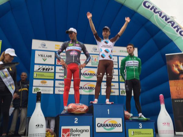 A poco menos de 50 kilómetros fueron todos neutralizados y surgieron los ataques del hermano menor de Vincenzo, Antonio Nibali, Madrazo y Fedi. Tras el segundo paso por San Luca, Nibali cedió. Bakelants y Berlato lo probaron desde atrás alcanzando al italiano y al español a solo 15 kilómetros de la meta. Descolgado Berlato, el pupilo de Lavenu escogió el momento clave para dejar a sus colegas de fuga y anotarse la victoria.
