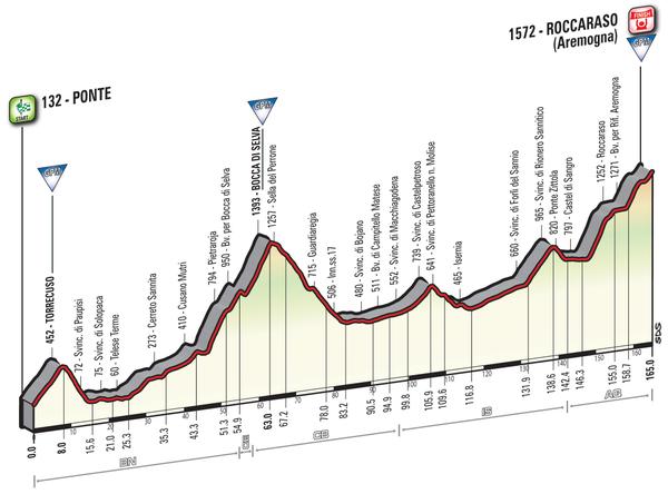 La montaña está repartida entre los Apeninos (6ª etapa en Roccaraso y 10ª en Sestola) y las cuatro en el epílogo alpino (13ª en Cividale del Friuli, 14ª en Corvara-Alta Badia, 19ª en la francesa Risoul y la penúltima en Sant’Anna di Vinadio). La prueba se cerrará en Turín y no en Milán.