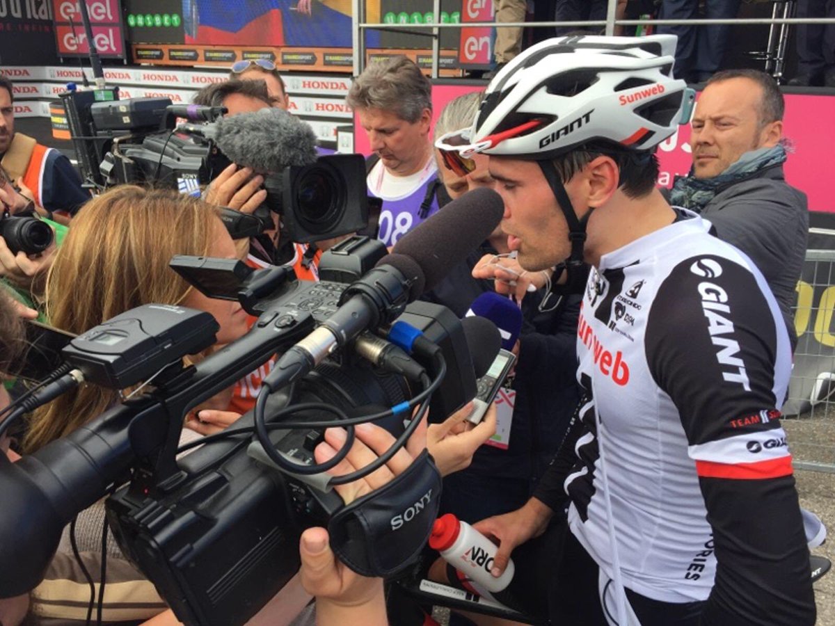 Aunque la maglia rosa ha ido a parar a Nairo Quintana (Movistar), muchos ven en Tom Dumoulin (Sunweb) al corredor más beneficiado tras la etapa de hoy. El holandés, mucho mejor contrarrelojista que escalador y, en teoría, con ventaja en ese terreno sobre el colombiano, se ha situado a 30 segundos del nuevo líder de la general. Pese a ello, el de Sunweb se ha mostrado decepcionado tras cruzar la meta en el Blockhaus. “Todo iba bien y Wilco [Kelderman] estaba trabajando muy bien. Tenía mucha confianza en él”. Su jefe de filas hablaba ya en pretérito sobre su compañero ya que conocía la noticia del abandono de Kelderman a causa de la caída que ha marcado la etapa y, seguramente, el Giro. “No pueso estar contento hoy porque hemos perdido a Wilco. No tengo ni idea de qué pintaba esa moto ahí. La he podido evitar en el último momento. De hecho, no la vi hasta que la tenía encima. Han faltado apenas un par de centímetros”. Dumoulin no podía ocultar su enorme enfado. “Dicen que esto son cosas que pasan… ¡pues no deberían de pasar!”.