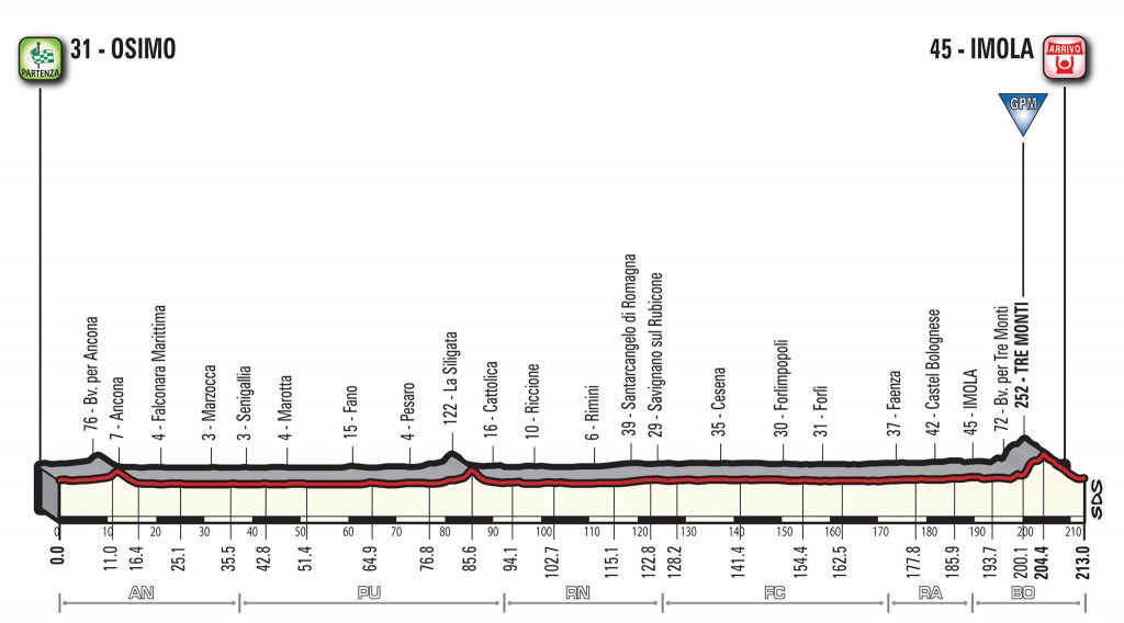 Para llegar a ese escenario, el grupo hubo de anular al trío de fugados de la jornada compuesto por Luis León Sánchez (Astana), Alessandro de Marchi (BMC), Fausto Masnada (Androni), Mirco Maestri (Bardiani) y Álex Turrin (Wilier). El murciano buscaba la sorpresa el día que se pasaba por el Muro di Filottrano, donde su excompañero y fallecido Michele Scarponi recibió un homenaje y donde Turrin y Maestri cedieron. El resto vieron como a 5 kilómetros del final fueron rebasados por la ofensiva estéril de Stybar y Wellens.