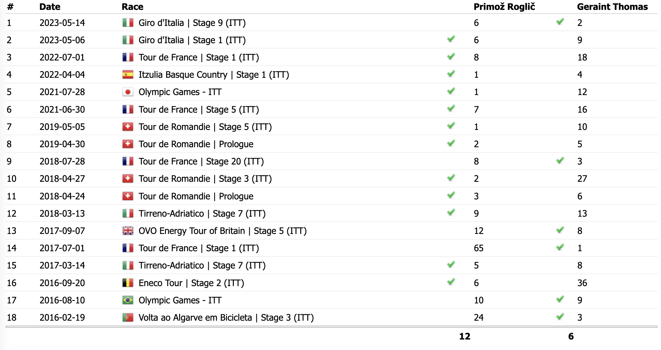 27 mayo. Saldo favorable para Primoz Roglic (Jumbo) sobre el líder del Giro de Italia, Geraint Thomas (Ineos) en sus enfrentamientos contrarreloj. El esloveno y actual campeón olímpico ha superado en 12 ocasiones al galés y, por ende, ha perdido en 6, la última en la pasada cronometrada de la 9ª etapa donde Thomas obtuvo 16 segundos de ventaja.