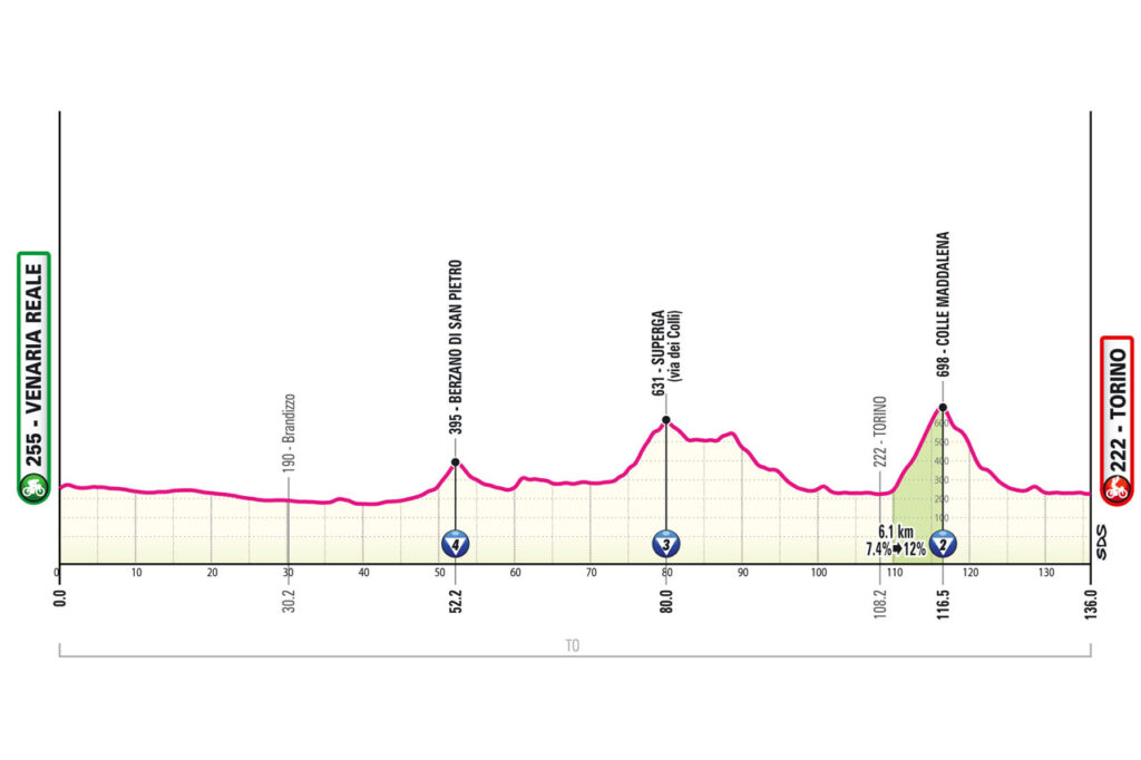Escenario movido con desafiante final que sacará a relucir a la intemperie desde el principio a los capitanes hacia Turín desde el norte. A continuación, se entra en un amplio circuito subiendo la subida de Pilonetto por la colina de Superga llegando a Moncalieri y al largo Po donde se sitúa la llegada. El circuito de unos 28 km se enfrenta a la subida del Hermitage que continúa hasta Colle Maddalena desde el lado de Corso Casale para descender de nuevo por Moncalieri y llegar a la llegada, pero a menos de tres kilómetros de la meta de Turín, se ha incluido la subida de San Vito, un muro de 1.400 metros con una pendiente media del 9,8%, tras las subidas precedentes por Superga y Colle della Maddalena.
