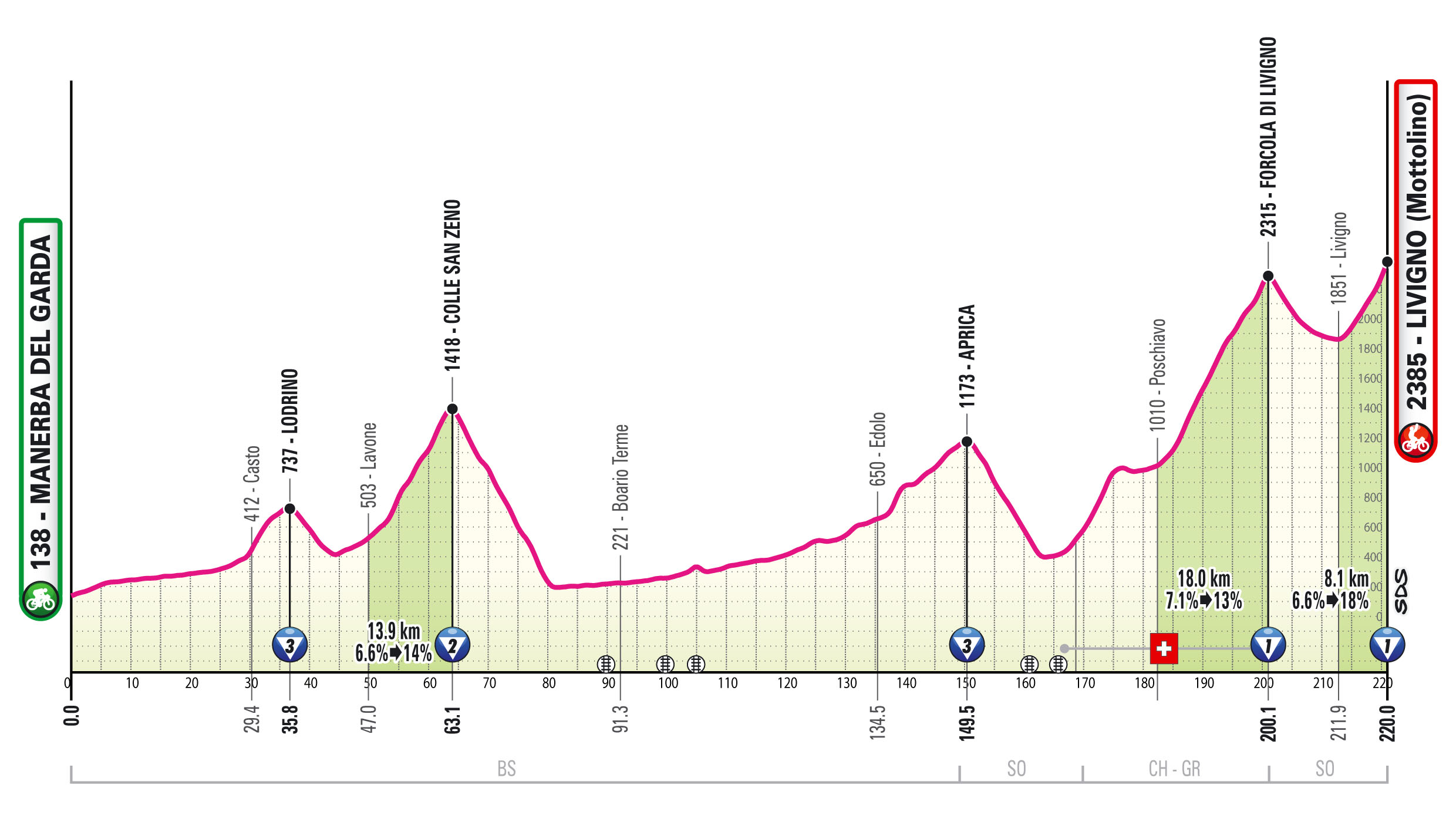 Etapa de alta montaña con final por encima de los 2000 m. Cinco subidas se superan con sólo el intervalo del Val Camonica, cuya ascensión representa el único «respiro». A la subida a Lodrino le sigue el inédito Colle San Zeno, cuyo descenso es muy largo y exigente. Los corredores llegarán a Edolo para subir al Mortirolo por el lado de Monno y descender a Valtellina. Larga subida a Bormio y, después de Isolaccia Valdidentro, subida al Passo di Foscagno. Tras un rápido descenso se afrontará el Passo d’Eira, ascendiendo los últimos 2 km por la pista de esquí de Mottolino.