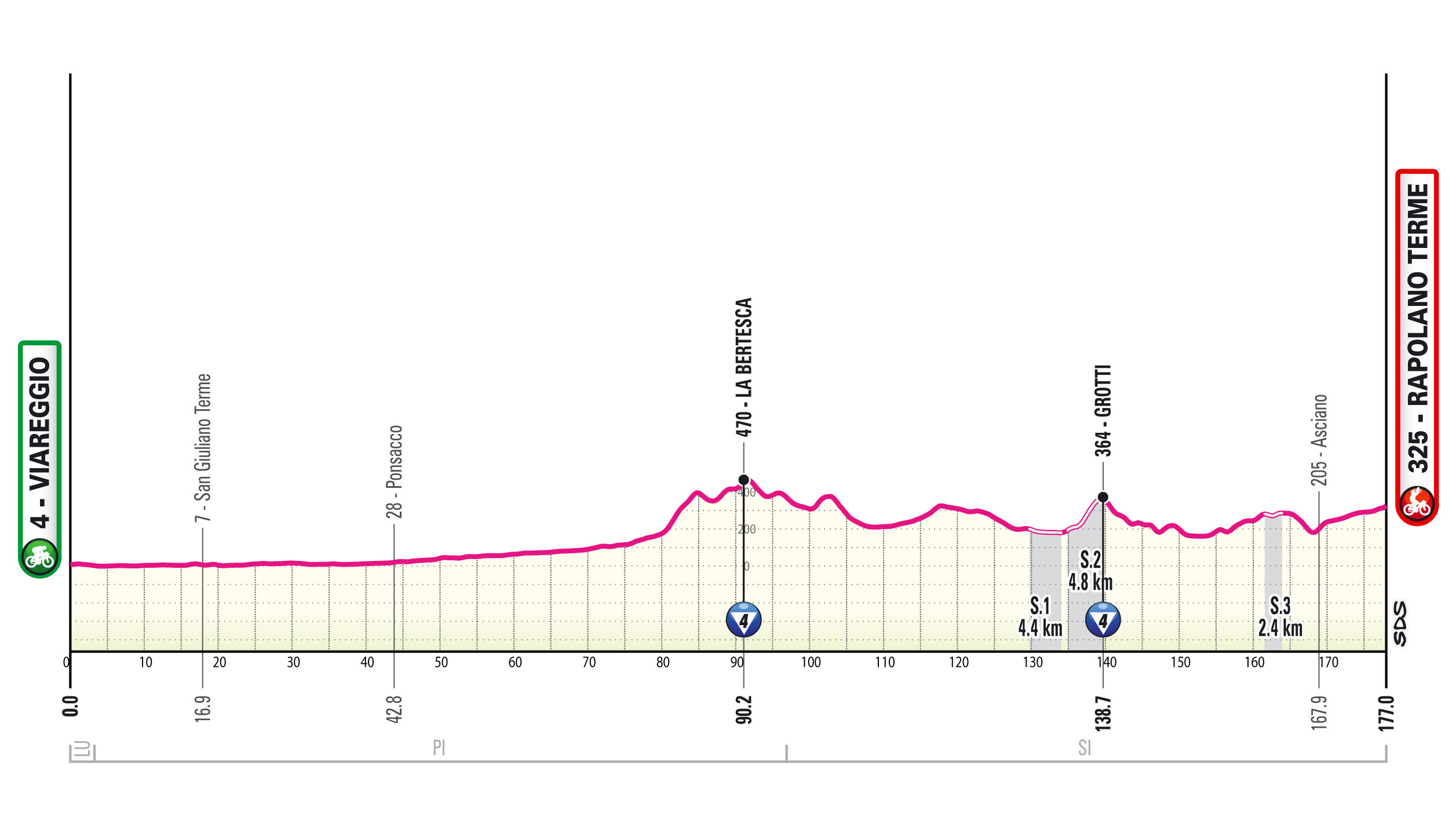 Etapa de tramos de tierra (sterrati) que se modifica pasando de 165 a 180 kilómetros. Partimos de Viareggio (Torre del Lago) para cruzar la zona pisana en Cascina, Ponsacco y tocar Volterra, el primer puerto puntuable 10 kilómetros antes que al anteriormente enclavado La Bertesca. Los tres sectores de gravilla siguen siendo Vidritta, Bagnaia (perteneciente a la Strade Bianche) y Pievina y se incluye un fuerte repecho previo a Serre di Rapolano, a 4.200 kilómetros del final.