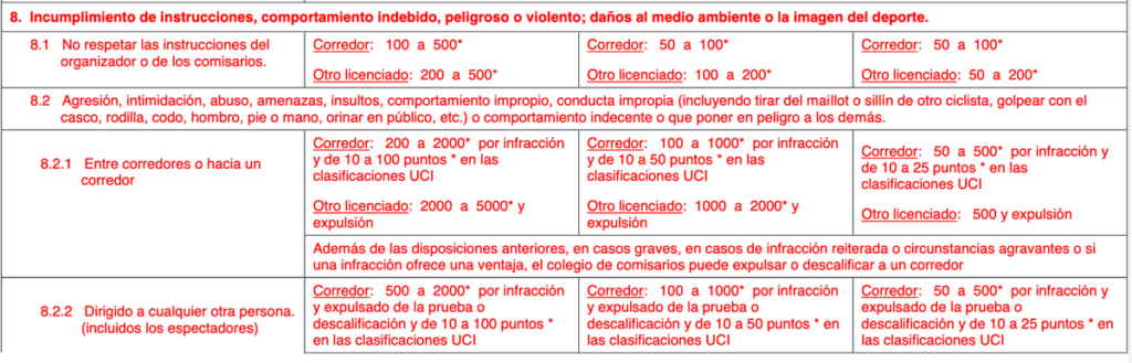 El reglamento del deporte ciclista de la UCI (artículo 8.2) es muy claro con este tipo de comportamientos indebidos, peligrosos o violentos, que causan daños al medio ambiente y/o a la imagen del deporte, y que incluyan o puedan incluir la agresión, intimidación, abuso, amenazas, insultos, comportamiento y/o conducta impropios o comportamiento indecente o que ponga en peligro a los demás. Y en el caso concreto hacia un espectador, la sanción del jurado comprende una multa de 500 a 2.000 francos suizos con expulsión o descalificación de carrera además de restarle de 10 a 100 puntos en las clasificaciones de la UCI.