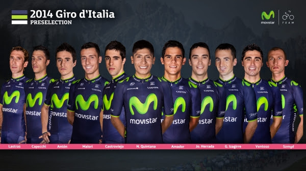 El mánager general de Movistar Team, Eusebio Unzué, maneja una lista de 11 corredores para la 97ª edición del Giro de Italia, que arrancará el próximo 9 de mayo en Belfast. Nairo Quintana encabeza una potente preselección en la que también figuran los italianos Adriano Malori y Eros Capecchi, el polaco Sylwester Szmyd, el costarricense Andrey Amador y los españoles Fran Ventoso, Pablo Lastras, Igor Antón, Jonathan Castroviejo, Gorka Izagirre y José Herrada.