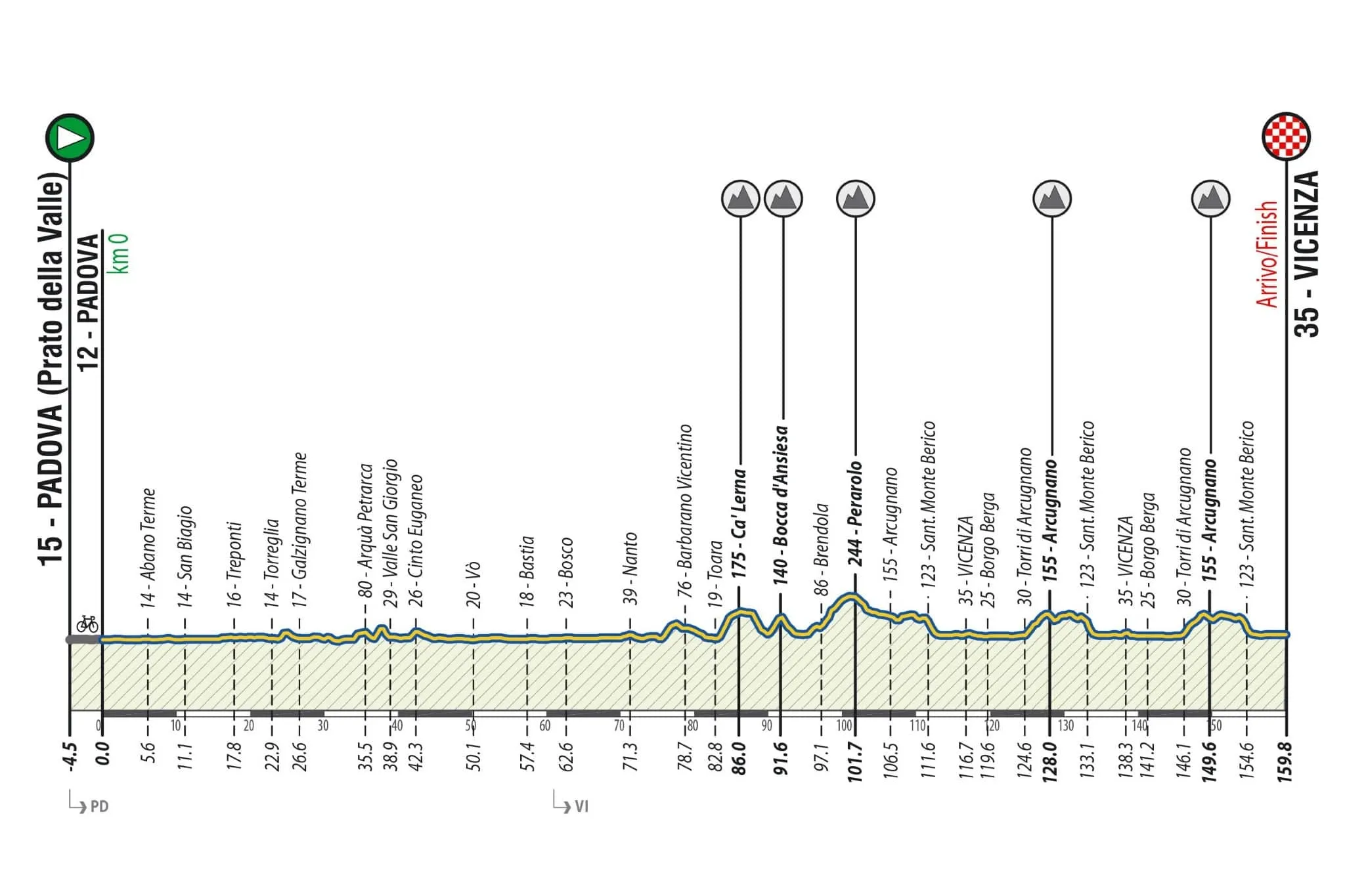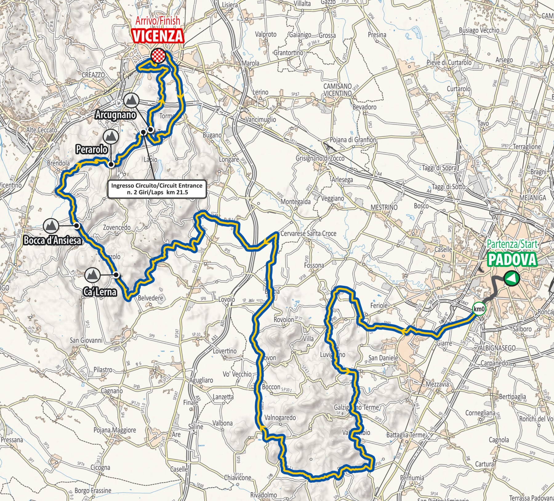 Una vez en Vicenza (primer paso tras 116 kilómetros de carrera), nos quedaremos en el circuito final, que tiene un total de 21,5 kilómetros y que se afrontará dos veces en su totalidad. El tramo más significativo desde el punto de vista de las dificultades, el combinado «Arcugnano-Monte Berico», en este caso será abordado para escalar (en particular el de Torri di Arcugnano a Arcugnano) y será muy probablemente el que será determinante a efectos del destino de la carrera, al menos en lo que se refiere a los atletas que no podrán seguir el ritmo de los mejores. La meta es en Vicenza, en Corso Palladio, después de una carrera de 159,8 kilómetros.