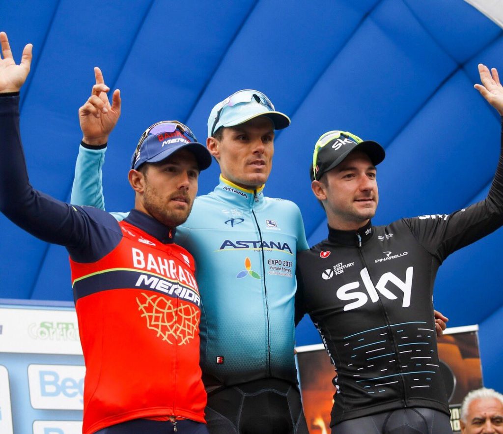 Sky y Bahrain se pusieron en rirmo de caza y dieron con ellos a 10 kilómetros del final. El grupo volvió a fragmentarse en la cota de Zappolino y a 5 del final el murciano Luis León Sánchez dio su estocada definitiva para dar otra lección de su clase y aunir su éxito al de la etapa de Fuglsang y la general final de Lutsenko en Almaty. Un montón de flores para la familia Scarponi.