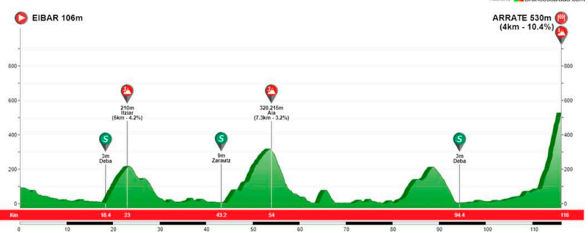 A partir de este momento, la carrera entrará en la parte decisiva. Un terreno rompepiernas llevará a las participantes hasta Éibar, localidad en la que comenzará la subida a la última dificultad montañosa de la prueba, el Alto de Arrate (1ª categoría, 4 km al 10,4 %).