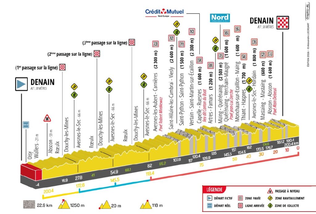El GP Denain 2026 contará con un recorrido muy similar al de la edición anterior. La clásica francesa se disputará el jueves 19 de marzo y propondrá un trazado de 200,4 kilómetros alrededor de la localidad de Denain, con un total de 13 sectores de pavé, algunos de ellos compartidos con la París-Roubaix, en una combinación pensada para favorecer la dureza y la selección.