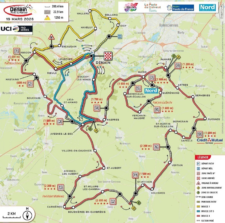 El GP Denain 2026 contará con un recorrido muy similar al de la edición anterior. La clásica francesa se disputará el jueves 19 de marzo y propondrá un trazado de 200,4 kilómetros alrededor de la localidad de Denain, con un total de 13 sectores de pavé, algunos de ellos compartidos con la París-Roubaix, en una combinación pensada para favorecer la dureza y la selección.