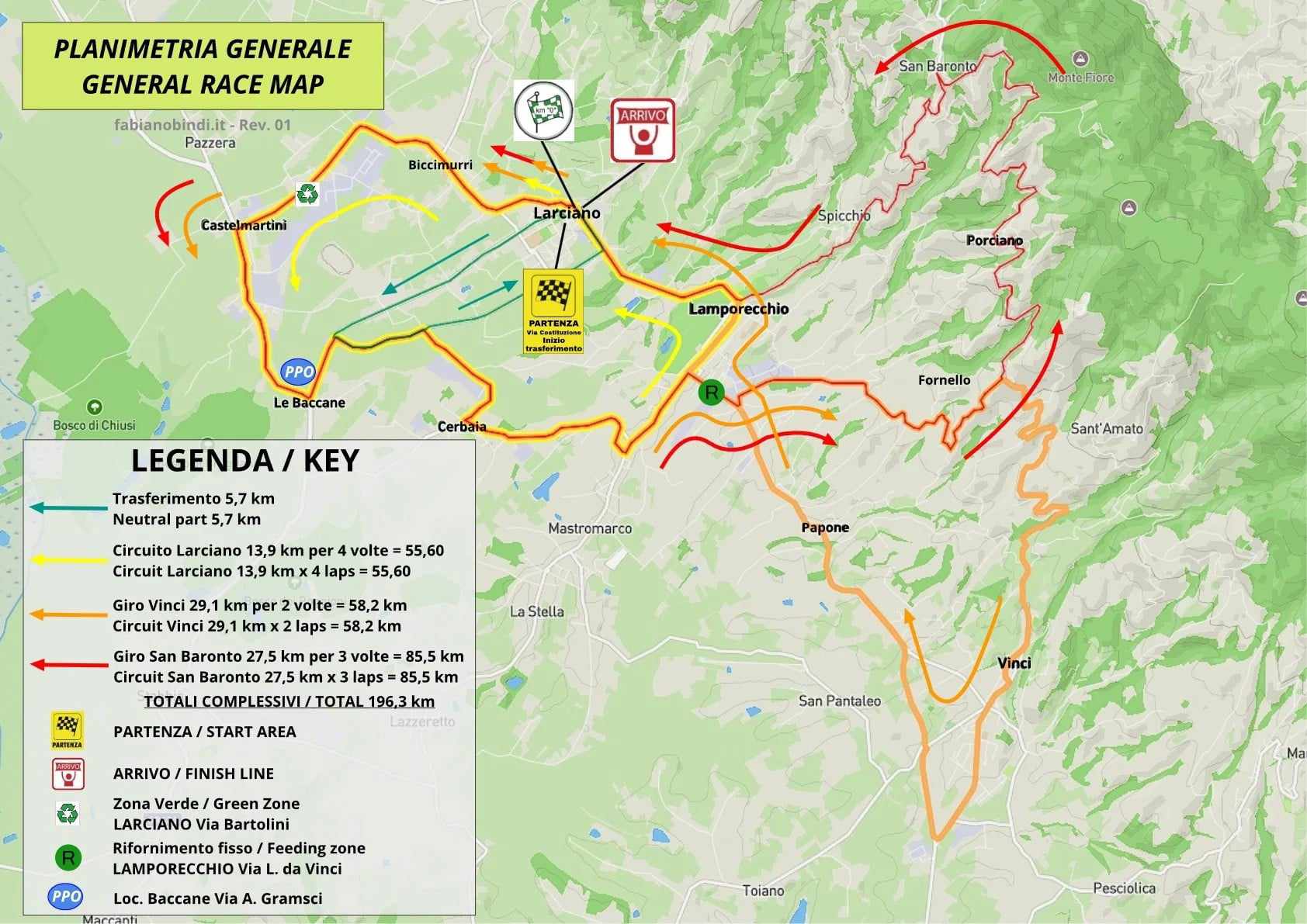 La 46ª edición del Gran Premio de Larciano (1.Pro), también conocido como GP Industria y Artigianato, se disputará el domingo 8 de septiembre y discurrirá sobre un trazado de 196,3 kilómetros con salida (11:30) y llegada (16:00) en la localidad italiana de Larciano. Los ciclistas se enfrentarán a tres circuitos: un primero de 13,9 km al que se darán cuatro vueltas, mayoritariamente llanas; el segundo, de 29,1 km que se completará en dos ocasiones, ascendiendo en ambas hasta Fornello; y un tercero de 27,5 km que se realizará hasta tres veces, ampliando los ascensos de Fornello hasta San Baronto.