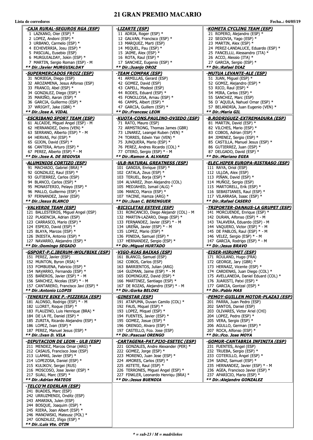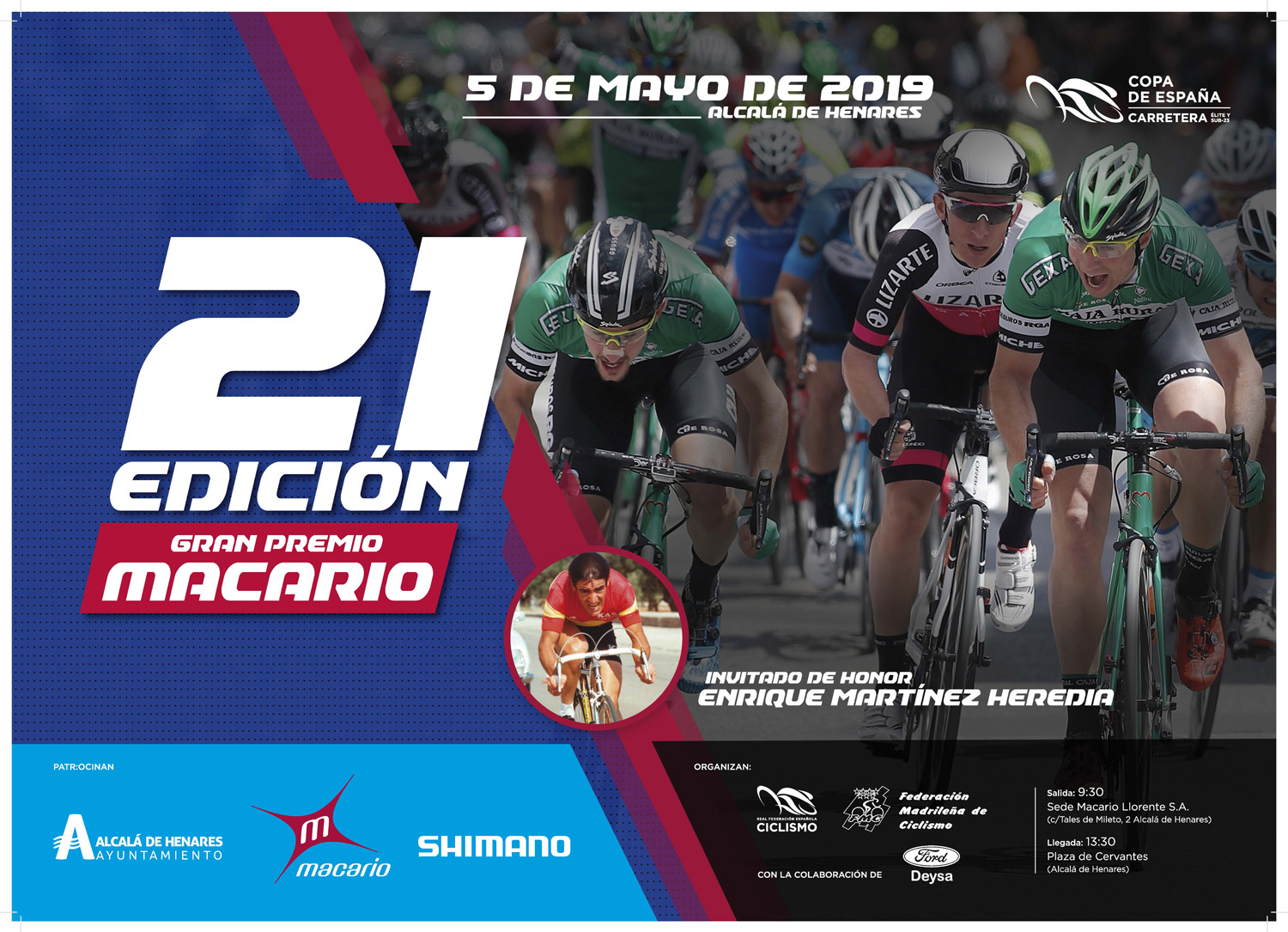 La Copa de España Élite y Sub-23 de ruta tendrá un año más su epílogo en Alcalá de Henares, con la disputa del XXI Gran Premio Macario. Desde la Federación Madrileña de Ciclismo, como organizadora de la carrera, nos empleamos a fondo para ya no sólo mantener el nivel de una cita como ésta, entre las mejores del calendario nacional, sino por mejorar y aumentar la calidad en todos los sentidos de la misma, en colaboración con el Ayuntamiento de Alcalá de Henares y la prestigiosa firma Macario.
