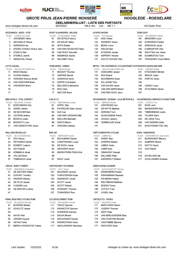 El ciclismo sigue adelante pese a la crisis del coronavirus que ha descabezado el calendario italiano y motivado la retirada temporal de doce equipos del World Tour. Ajeno a estos problemas, el domingo 8 de marzo vuelve el Gran Premio Jean-Pierre Monseré, prueba belga de categoría 1.1 enmarcada en el UCI Europa Tour que el pasado año no se celebró debido a un fuerte temporal.