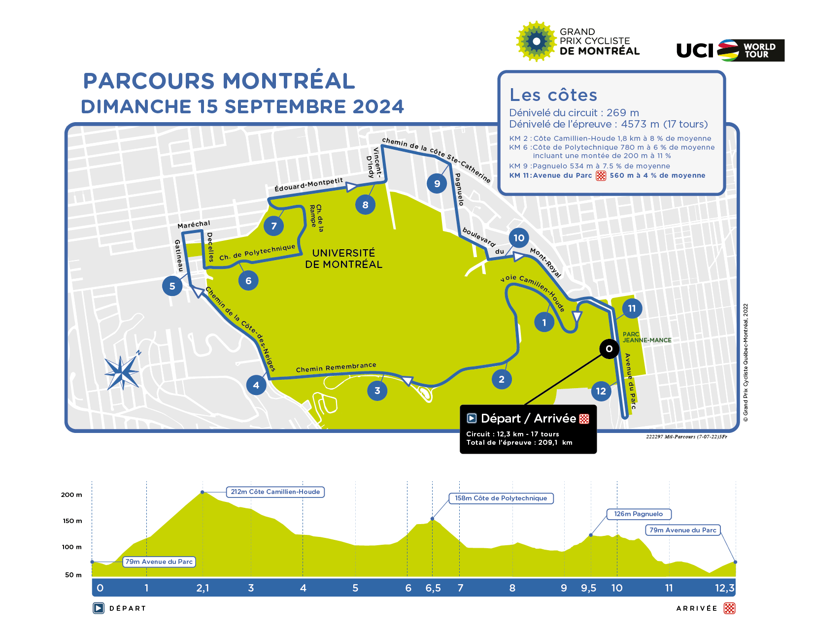 El recorrido consistirá en dar un total de 17 vueltas al tradicional circuito en 12,3 kilómetros en Montreal, completando un total de 209,1 kilómetros. En la parte final de cada bucle se enlazarán las pequeñas subidas a la Côte Camillien-Houde, la Côte de Polytechnique, Pagnuelo y la Avenue de Parc.