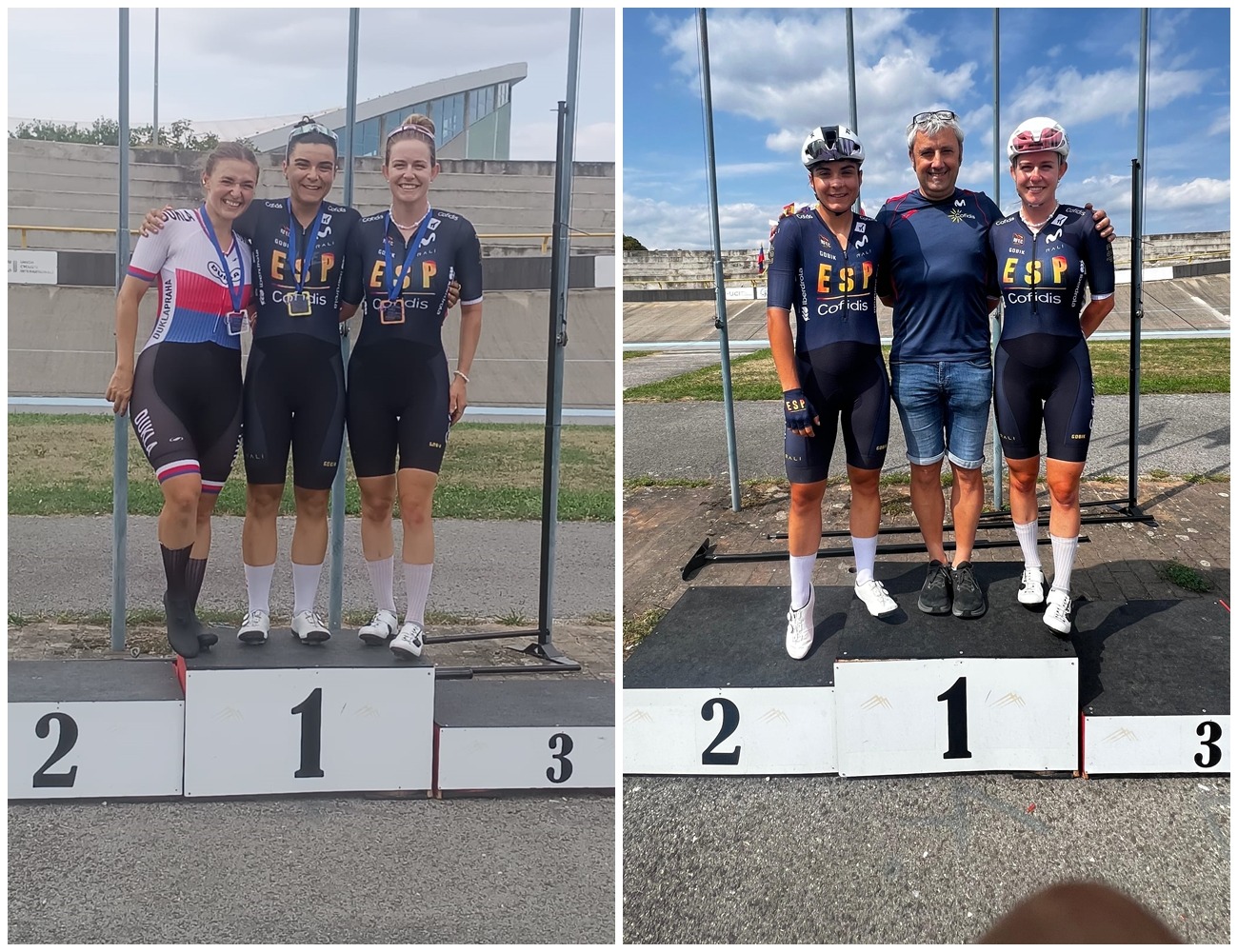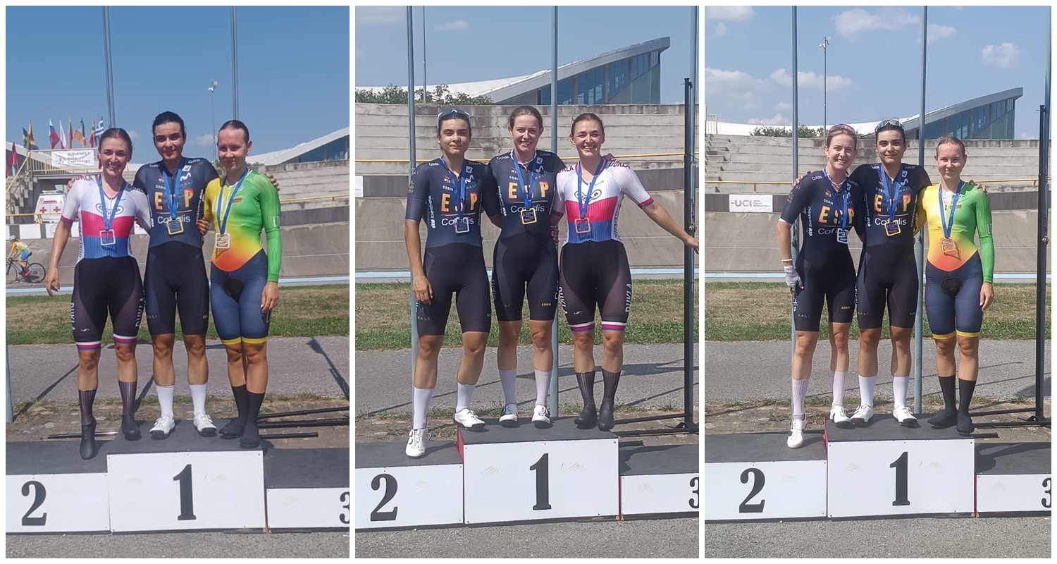 De arriba a abajo y de izquierda a derecha, podios femeninos de scratch, puntuación y eliminación y masculino de omnium © Española y GP Presov