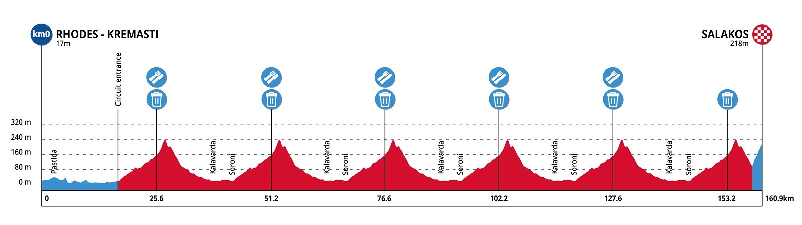 La capital de la isla, Rodas, acogerá la salida de esta prueba con un recorrido de 160,9 kilómetros dividido en un breve tramo inicial en línea recta y un circuito de 25,6 kilómetros que se repetirá cinco veces y media. A diferencia del día anterior, este circuito solo contará con una subida, que se escalará en seis ocasiones, y tras el último paso y el posterior descenso se saldrá del circuito para afrontar el tramo final de poco más de 2000 metros que llevará a la meta de Salakos, la misma que ya se propuso en la carrera «hermana».
